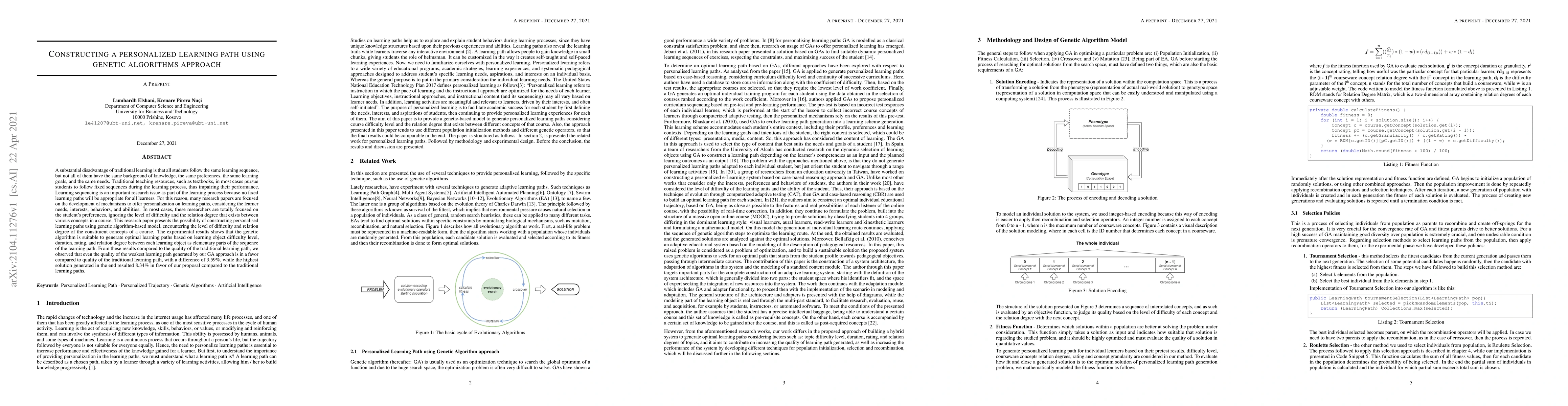 A substantial disadvantage of traditional learning is that all students follow the same learning sequence, but not all of them have the same background of knowledge, the same preferences, the same learning goals, and the same needs. Traditional teaching resources, such as textbooks, in most cases pursue students to follow fixed sequences during the learning process, thus impairing their performance. Learning sequencing is an important research issue as part of the learning process because no fixed learning paths will be appropriate for all learners. For this reason, many research papers are focused on the development of mechanisms to offer personalization on learning paths, considering the learner needs, interests, behaviors, and abilities. In most cases, these researchers are totally focused on the student's preferences, ignoring the level of difficulty and the relation degree that exists between various concepts in a course. This research paper presents the possibility of constructing personalized learning paths using genetic algorithm-based model, encountering the level of difficulty and relation degree of the constituent concepts of a course. The experimental results shows that the genetic algorithm is suitable to generate optimal learning paths based on learning object difficulty level, duration, rating, and relation degree between each learning object as elementary parts of the sequence of the learning path. From these results compared to the quality of the traditional learning path, we observed that even the quality of the weakest learning path generated by our GA approach is in a favor compared to quality of the traditional learning path, with a difference of 3.59\%, while the highest solution generated in the end resulted 8.34\% in favor of our proposal compared to the traditional learning paths.