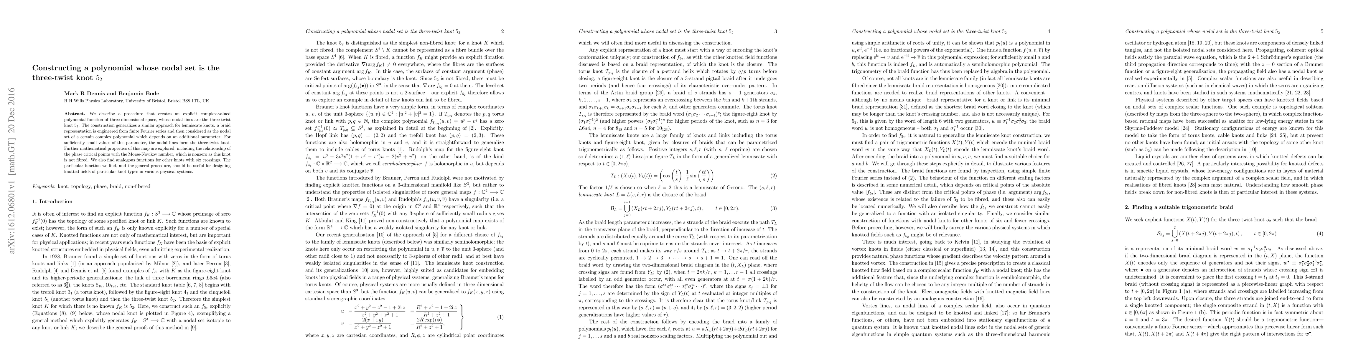 We describe a procedure that creates an explicit complex-valued polynomial function of three-dimensional space, whose nodal lines are the three-twist knot $5_2$. The construction generalizes a similar approach for lemniscate knots: a braid representation is engineered from finite Fourier series and then considered as the nodal set of a certain complex polynomial which depends on an additional parameter. For sufficiently small values of this parameter, the nodal lines form the three-twist knot. Further mathematical properties of this map are explored, including the relationship of the phase critical points with the Morse-Novikov number, which is nonzero as this knot is not fibred. We also find analogous functions for other knots with six crossings. The particular function we find, and the general procedure, should be useful for designing knotted fields of particular knot types in various physical systems.