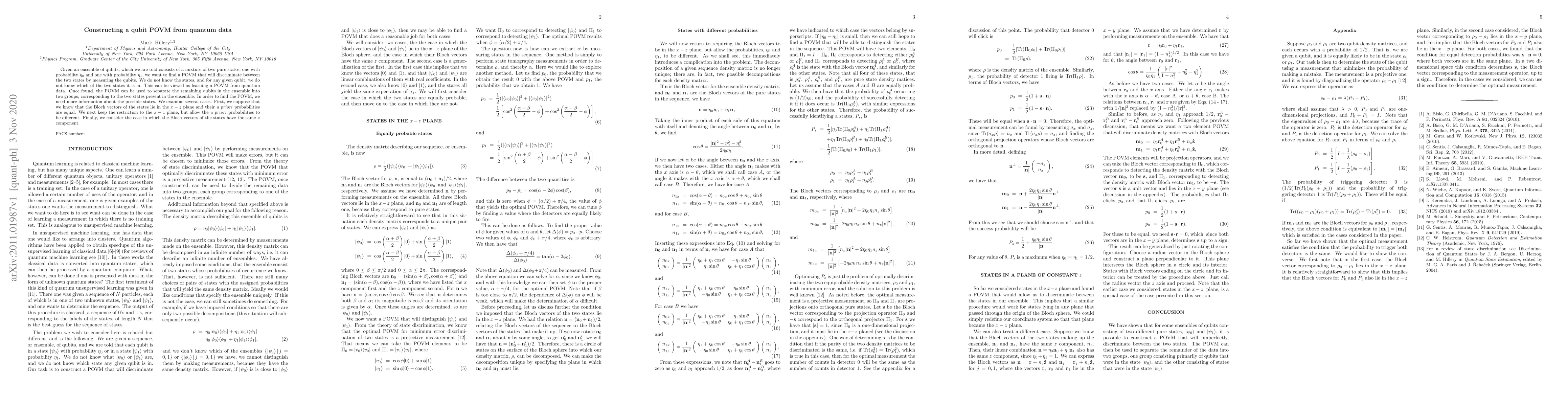 Given an ensemble of qubits, which we are told consists of a mixture of two pure states, one with probability $\eta_{0}$ and one with probability $\eta_{1}$, we want to find a POVM that will discriminate between the two states by measuring the qubits. We do not know the states, and for any given qubit, we do not know which of the two states it is in. This can be viewed as learning a POVM from quantum data. Once found, the POVM can be used to separate the remaining qubits in the ensemble into two groups, corresponding to the two states present in the ensemble. In order to find the POVM, we need more information about the possible states. We examine several cases. First, we suppose that we know that the Bloch vectors of the states lie in the x-z plane and their \emph{a priori} probabilities are equal. We next keep the restriction to the x-z plane, but allow the \emph{a priori} probabilities to be different. Finally, we consider the case in which the Bloch vectors of the states have the same z component.
