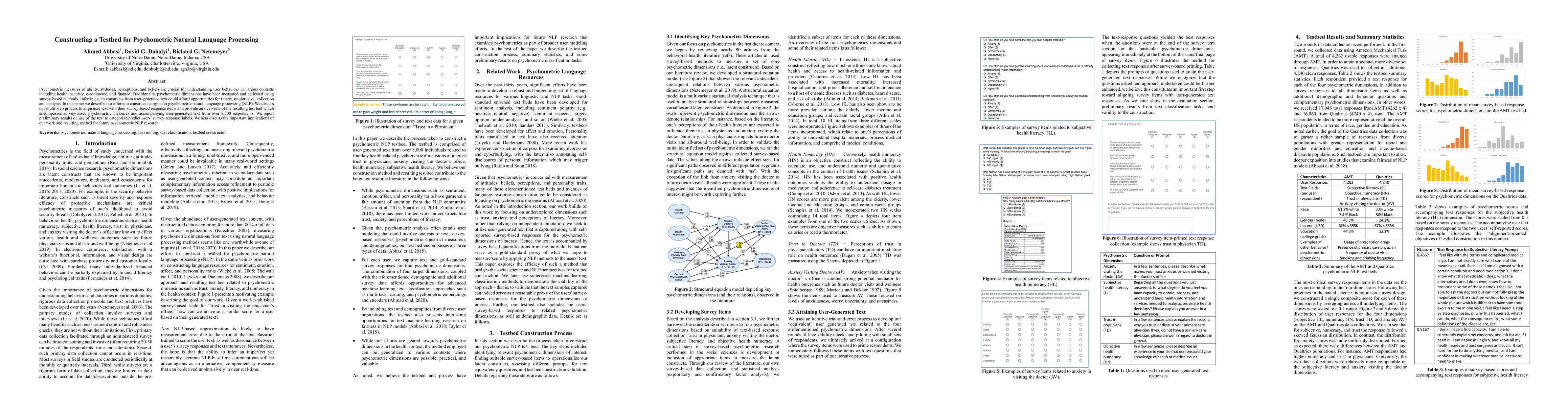 Psychometric measures of ability, attitudes, perceptions, and beliefs are crucial for understanding user behaviors in various contexts including health, security, e-commerce, and finance. Traditionally, psychometric dimensions have been measured and collected using survey-based methods. Inferring such constructs from user-generated text could afford opportunities for timely, unobtrusive, collection and analysis. In this paper, we describe our efforts to construct a corpus for psychometric natural language processing (NLP). We discuss our multi-step process to align user text with their survey-based response items and provide an overview of the resulting testbed which encompasses survey-based psychometric measures and accompanying user-generated text from over 8,500 respondents. We report preliminary results on the use of the text to categorize/predict users' survey response labels. We also discuss the important implications of our work and resulting testbed for future psychometric NLP research.