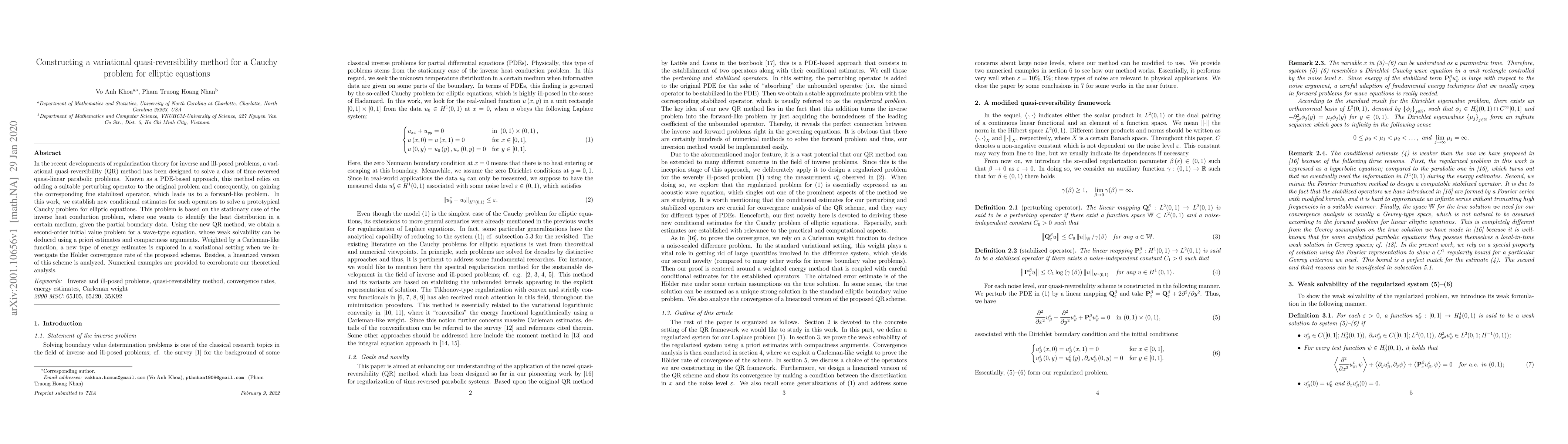In the recent developments of regularization theory for inverse and ill-posed problems, a variational quasi-reversibility (QR) method has been designed to solve a class of time-reversed quasi-linear parabolic problems. Known as a PDE-based approach, this method relies on adding a suitable perturbing operator to the original problem and consequently, on gaining the corresponding fine stabilized operator, which leads us to a forward-like problem. In this work, we establish new conditional estimates for such operators to solve a prototypical Cauchy problem for elliptic equations. This problem is based on the stationary case of the inverse heat conduction problem, where one wants to identify the heat distribution in a certain medium, given the partial boundary data. Using the new QR method, we obtain a second-order initial value problem for a wave-type equation, whose weak solvability can be deduced using a priori estimates and compactness arguments. Weighted by a Carleman-like function, a new type of energy estimates is explored in a variational setting when we investigate the H\"older convergence rate of the proposed scheme. Besides, a linearized version of this scheme is analyzed. Numerical examples are provided to corroborate our theoretical analysis.