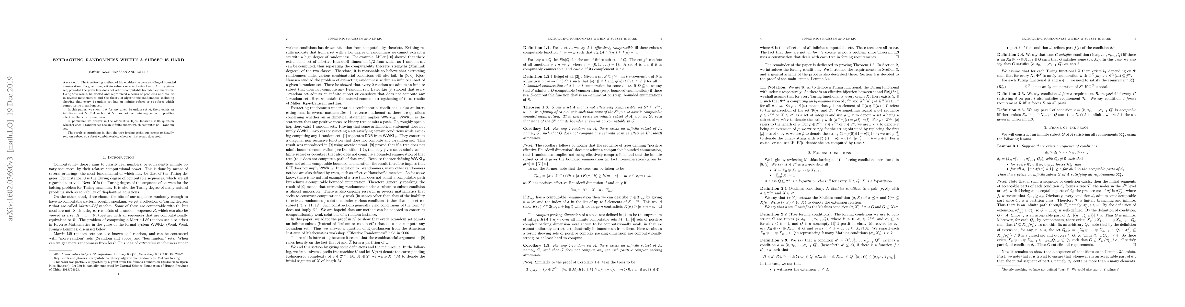 The tree forcing method given by (Liu 2015) enables the cone avoiding of strong enumeration of a given tree, within a subset or co-subset of an arbitrary given set, provided the given tree does not admit computable strong enumeration. Using this result, we settled and reproduced a series of problems in reverse mathematics. In this paper, we demonstrate cone avoiding results within an infinite subset of a given 1-random set. We show that for any given 1-random set $X$, there exists an infinite subset $Y$ of $X$ such that $Y$ does not compute any real with positive effective Hausdorff dimension, thus answering negatively a question posed by Kjos-Hanssen that whether there exists a 1-random set of which any infinite subset computes some 1-random real. The result is surprising in that the tree forcing technique used on the subset or co-subset seems to heavily rely on subset co-subset combinatorics, whereas this result does not.