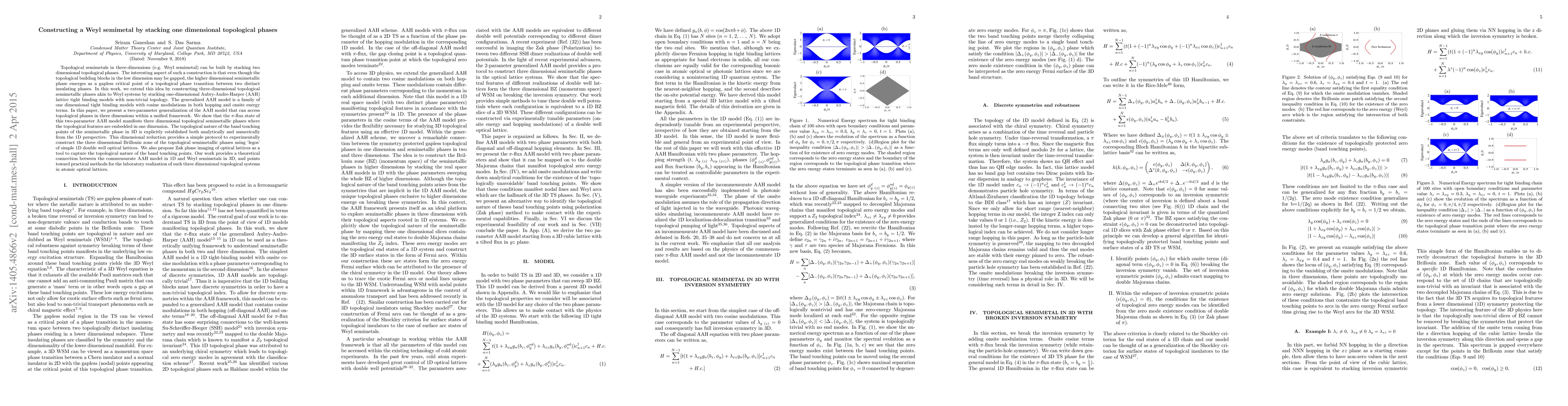 This paper constructs three-dimensional Weyl semimetals by stacking one-dimensional Aubry-Andre-Harper lattice models, demonstrating that topological features in 3D can emerge from 1D systems. The proposed two-parameter AAH model provides a pathway to realize these semimetals in optical lattices, with Zak phase imaging suggested as a tool for capturing their topological nature.