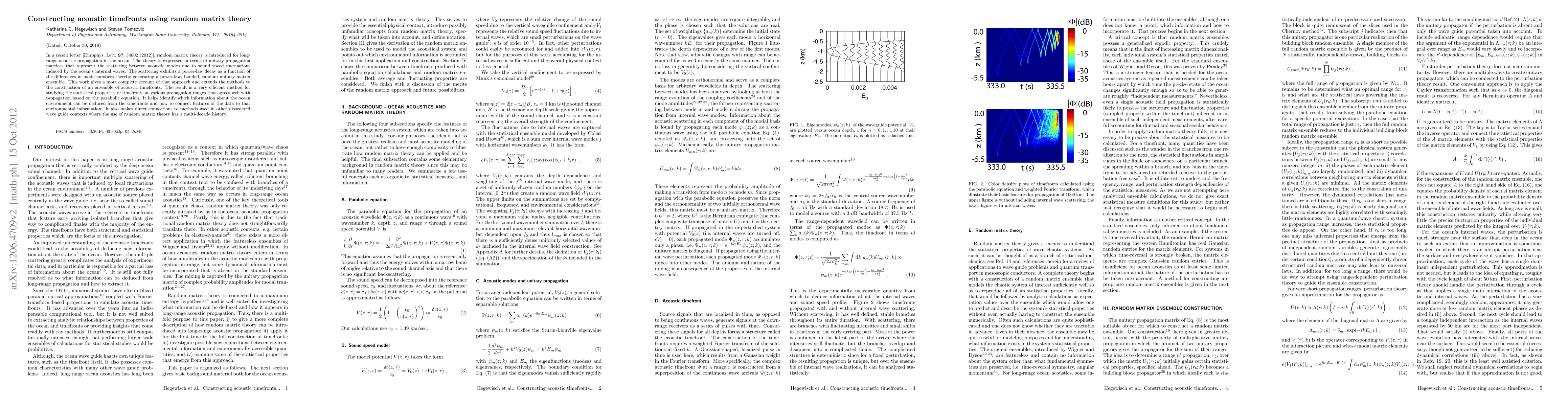 In a recent letter [Europhys. Lett. 97, 34002 (2012)], random matrix theory is introduced for long-range acoustic propagation in the ocean. The theory is expressed in terms of unitary propagation matrices that represent the scattering between acoustic modes due to sound speed fluctuations induced by the ocean's internal waves. The scattering exhibits a power-law decay as a function of the differences in mode numbers thereby generating a power-law, banded, random unitary matrix ensemble. This work gives a more complete account of that approach and extends the methods to the construction of an ensemble of acoustic timefronts. The result is a very efficient method for studying the statistical properties of timefronts at various propagation ranges that agrees well with propagation based on the parabolic equation. It helps identify which information about the ocean environment survives in the timefronts and how to connect features of the data to the surviving environmental information. It also makes direct connections to methods used in other disordered wave guide contexts where the use of random matrix theory has a multi-decade history.