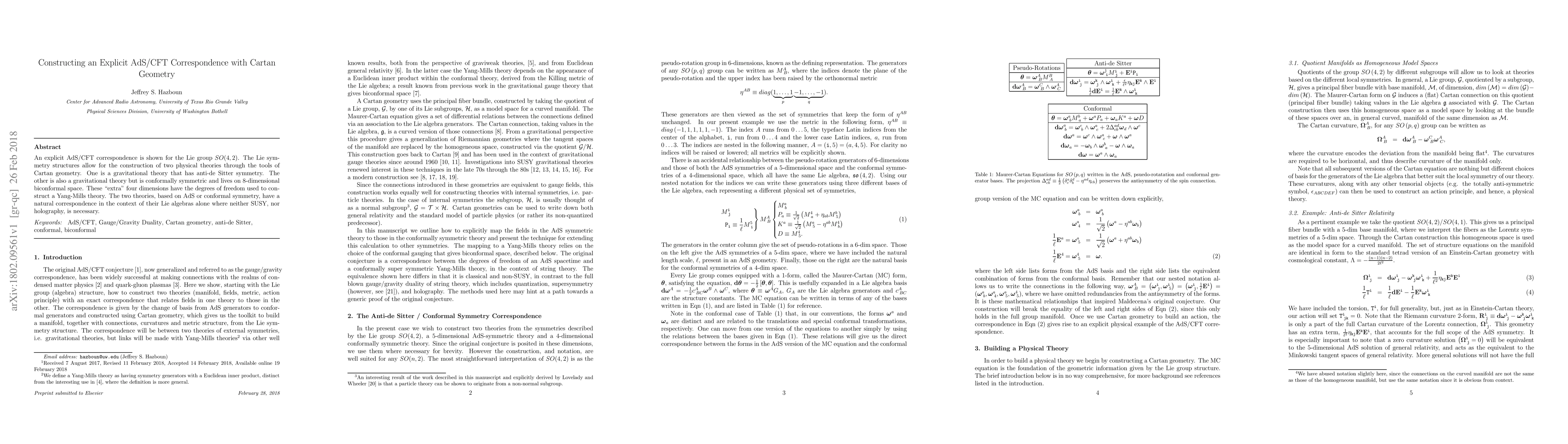 This paper constructs an explicit AdS/CFT correspondence using Cartan geometry for the Lie group $SO(4,2)$, establishing a gravitational theory with anti-de Sitter symmetry and another conformally symmetric one in 8-dimensional biconformal space, revealing a natural correspondence based solely on their Lie algebras.