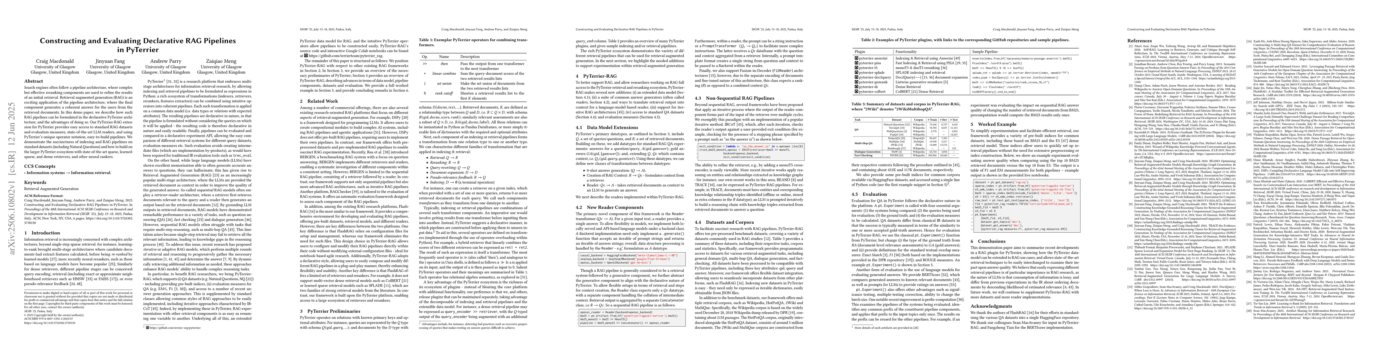 This paper introduces a way to build and evaluate retrieval augmented generation (RAG) pipelines in PyTerrier, showcasing their advantages and potential applications.