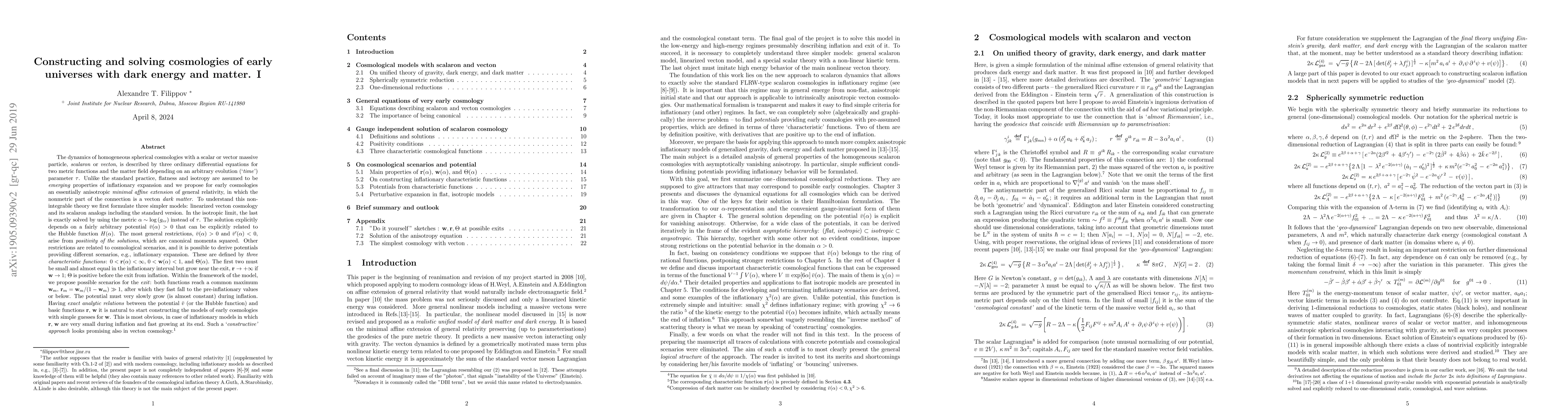 The main purpose of this paper is to advance a unified theory of dark matter, dark energy, and inflation first formulated in 2008. Our minimal affine extension of the GR has geodesics coinciding with the pseudo Riemannian ones, up to parameterizations. It predicts a `sterile' massive vecton and depends on two new dimensional constants, which can be measured in the limit of small vecton velocity. In a special gauge, this velocity has an upper limit near which it grows to infinity. The linearized vecton theory is similar to the scalar models of inflation except the fact of internal anisotropy of the vecton. For this reason we study general solutions of scalar analogs of the vecton theory without restricting the curvature parameter and anisotropy by using previously derived exact solutions as functions of the metric. It is shown that the effects of curvature and anisotropy fast decrease in expanding universes. Our approach can be applied to anisotropic universes, which is demonstrated on an exactly solvable strongly anisotropic cosmology. To characterize different cosmological scenarios in detail we introduce three characteristic functions, two of which are small and almost equal during inflation and grow near the exit. Instead of the potential it is possible to use one of the two characteristic functions. This allows to approximately derive flat isotropic universes with `prescribed' scenarios, which is the essence of our constructive cosmology of early universes. The most natural application of our approach is in analytically constructing characteristic functions of inflationary models with natural exits. However, the general construction can be applied to other problems, e.g., to evolution of contracting universes.