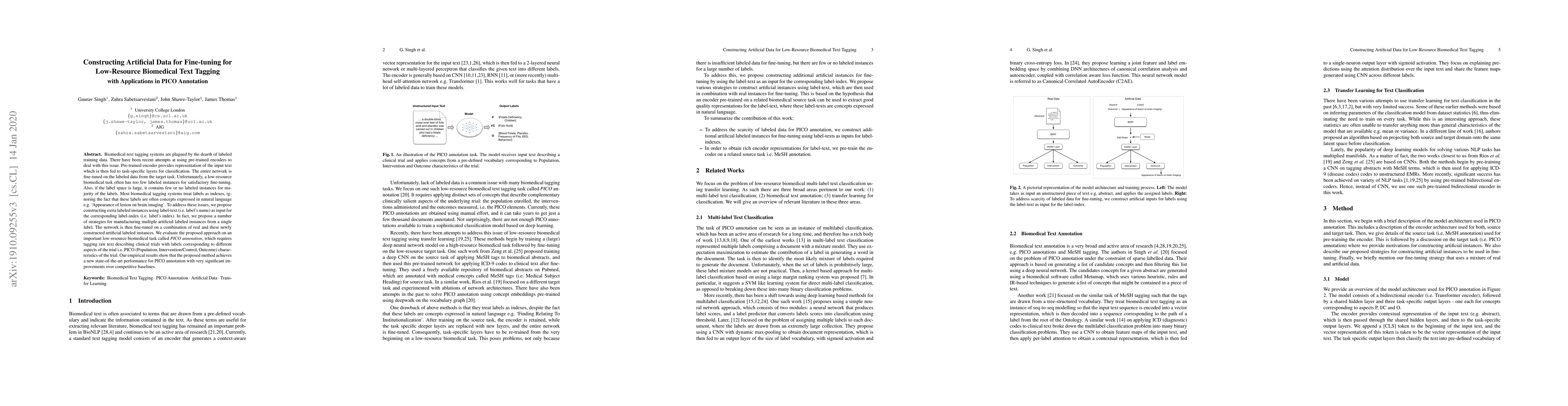Biomedical text tagging systems are plagued by the dearth of labeled training data. There have been recent attempts at using pre-trained encoders to deal with this issue. Pre-trained encoder provides representation of the input text which is then fed to task-specific layers for classification. The entire network is fine-tuned on the labeled data from the target task. Unfortunately, a low-resource biomedical task often has too few labeled instances for satisfactory fine-tuning. Also, if the label space is large, it contains few or no labeled instances for majority of the labels. Most biomedical tagging systems treat labels as indexes, ignoring the fact that these labels are often concepts expressed in natural language e.g. `Appearance of lesion on brain imaging'. To address these issues, we propose constructing extra labeled instances using label-text (i.e. label's name) as input for the corresponding label-index (i.e. label's index). In fact, we propose a number of strategies for manufacturing multiple artificial labeled instances from a single label. The network is then fine-tuned on a combination of real and these newly constructed artificial labeled instances. We evaluate the proposed approach on an important low-resource biomedical task called \textit{PICO annotation}, which requires tagging raw text describing clinical trials with labels corresponding to different aspects of the trial i.e. PICO (Population, Intervention/Control, Outcome) characteristics of the trial. Our empirical results show that the proposed method achieves a new state-of-the-art performance for PICO annotation with very significant improvements over competitive baselines.