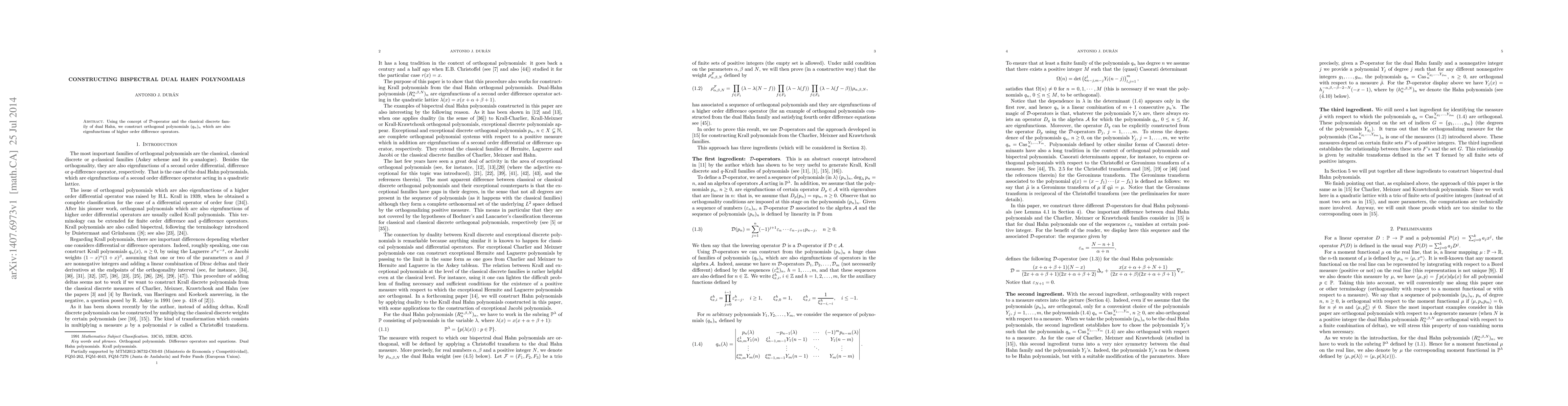 The paper presents a technical construction of bispectral dual Hahn polynomials using D-operators and discrete families, along with a method to verify their orthogonality.