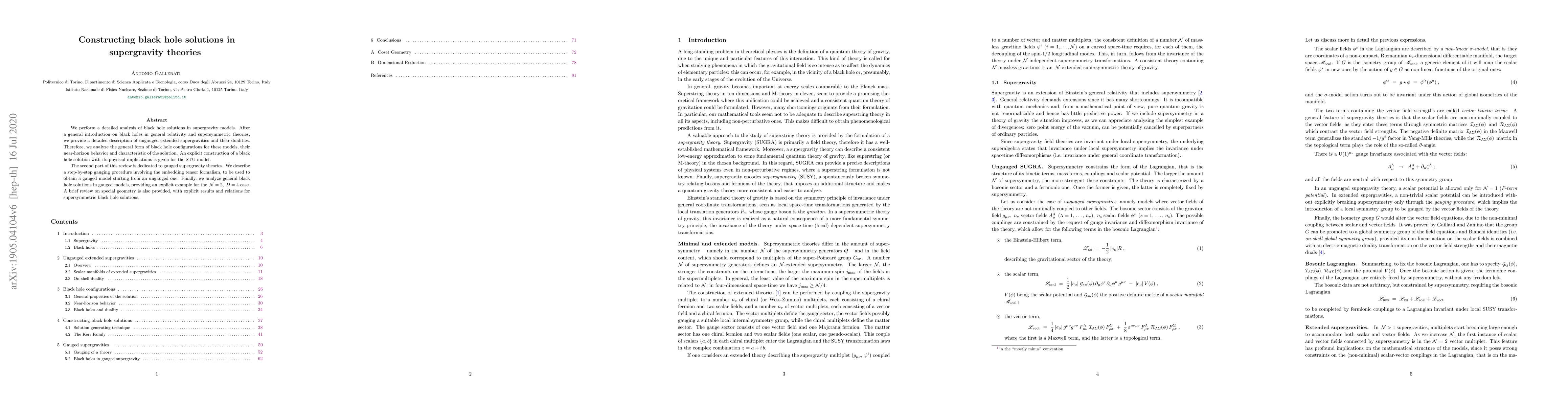 We perform a detailed analysis of black hole solutions in supergravity models. After a general introduction on black holes in general relativity and supersymmetric theories, we provide a detailed description of ungauged extended supergravities and their dualities. Therefore, we analyze the general form of black hole configurations for these models, their near-horizon behavior and characteristic of the solution. An explicit construction of a black hole solution with its physical implications is given for the STU-model. The second part of this review is dedicated to gauged supergravity theories. We describe a step-by-step gauging procedure involving the embedding tensor formalism, to be used to obtain a gauged model starting from an ungauged one. Finally, we analyze general black hole solutions in gauged models, providing an explicit example for the $\,\mathcal{N}=2$, $\,D=4$ case. A brief review on special geometry is also provided, with explicit results and relations for supersymmetric black hole solutions.