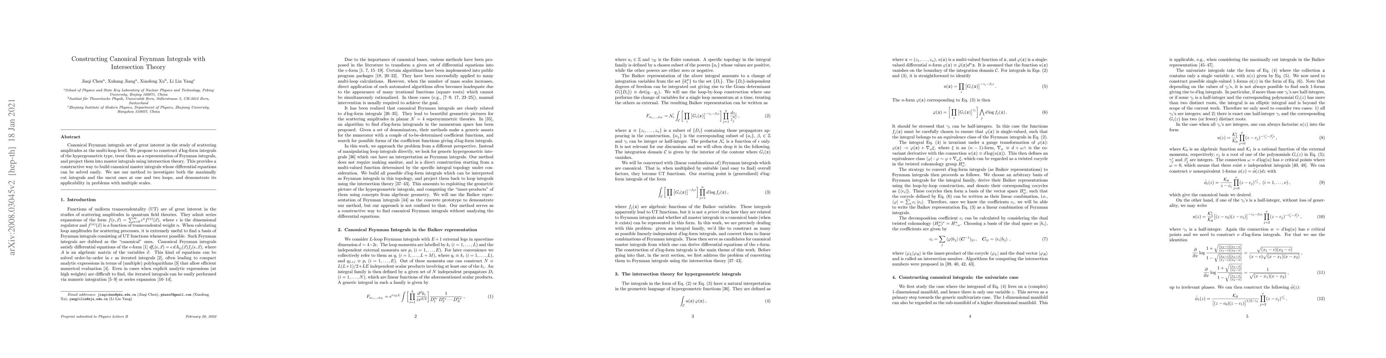 This paper proposes a method to construct canonical Feynman integrals using $d\log$-form integrals and intersection theory, enabling the simplification of differential equations for master integrals. The approach is demonstrated on both maximally cut and uncut integrals at one and two loops, showing its effectiveness in multi-scale problems.