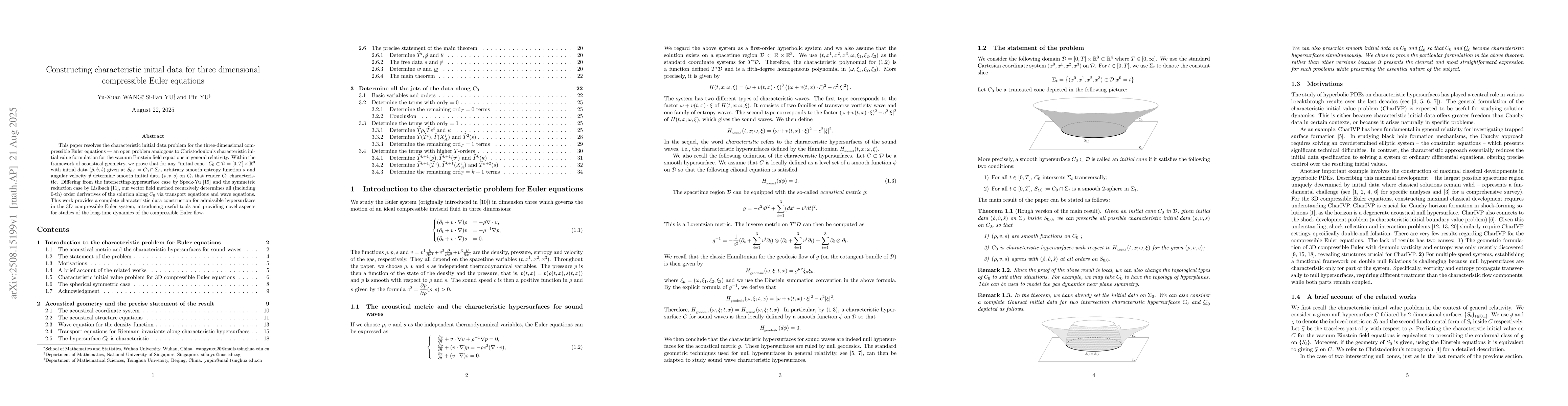 This paper resolves the characteristic initial data problem for the three-dimensional compressible Euler equations - an open problem analogous to Christodoulou's characteristic initial value formulation for the vacuum Einstein field equations in general relativity. Within the framework of acoustical geometry, we prove that for any "initial cone" $C_0\subset \mathcal{D}=[0,T]\times\mathbb{R}^3$ with initial data $(\mathring{\rho},\mathring{v},\mathring{s})$ given at $S_{0,0}=C_0\cap \Sigma_0$, arbitrary smooth entropy function and angular velocity determine smooth initial data $(\rho,v,s)$ on $C_0$ that render $C_0$ characteristic. Differing from the intersecting-hypersurface case by Speck-Yu [19] and the symmetric reduction case by Lisibach [11], our vector field method recursively determines all (including $0$-th) order derivatives of the solution along $C_0$ via transport equations and wave equations. This work provides a complete characteristic data construction for admissible hypersurfaces in the 3D compressible Euler system, introducing useful tools and providing novel aspects for studies of the long-time dynamics of the compressible Euler flow.