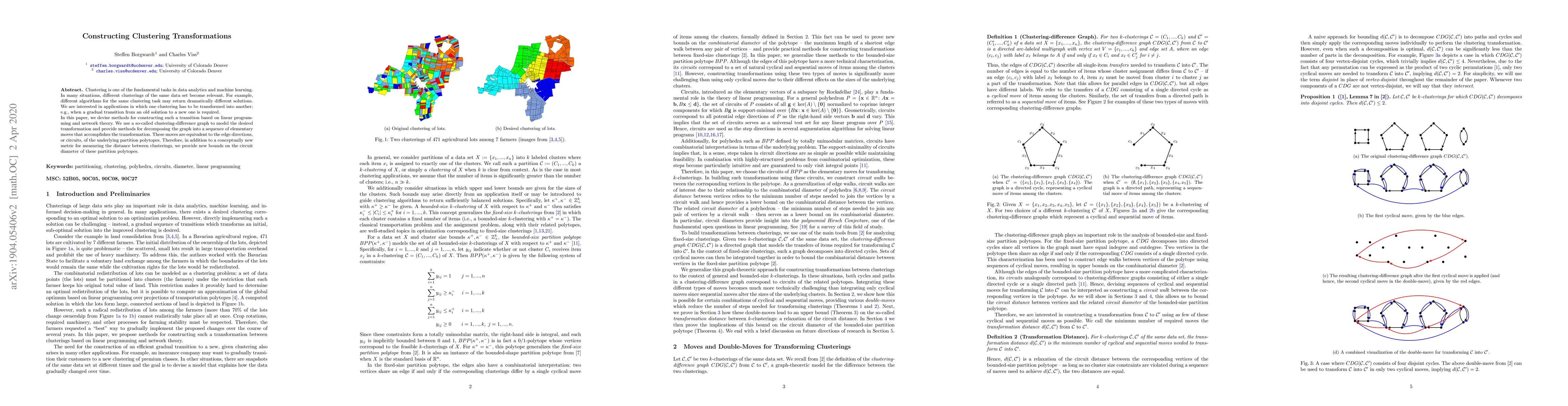 Clustering is one of the fundamental tasks in data analytics and machine learning. In many situations, different clusterings of the same data set become relevant. For example, different algorithms for the same clustering task may return dramatically different solutions. We are interested in applications in which one clustering has to be transformed into another; e.g., when a gradual transition from an old solution to a new one is required. In this paper, we devise methods for constructing such a transition based on linear programming and network theory. We use a so-called clustering-difference graph to model the desired transformation and provide methods for decomposing the graph into a sequence of elementary moves that accomplishes the transformation. These moves are equivalent to the edge directions, or circuits, of the underlying partition polytopes. Therefore, in addition to a conceptually new metric for measuring the distance between clusterings, we provide new bounds on the circuit diameter of these partition polytopes.