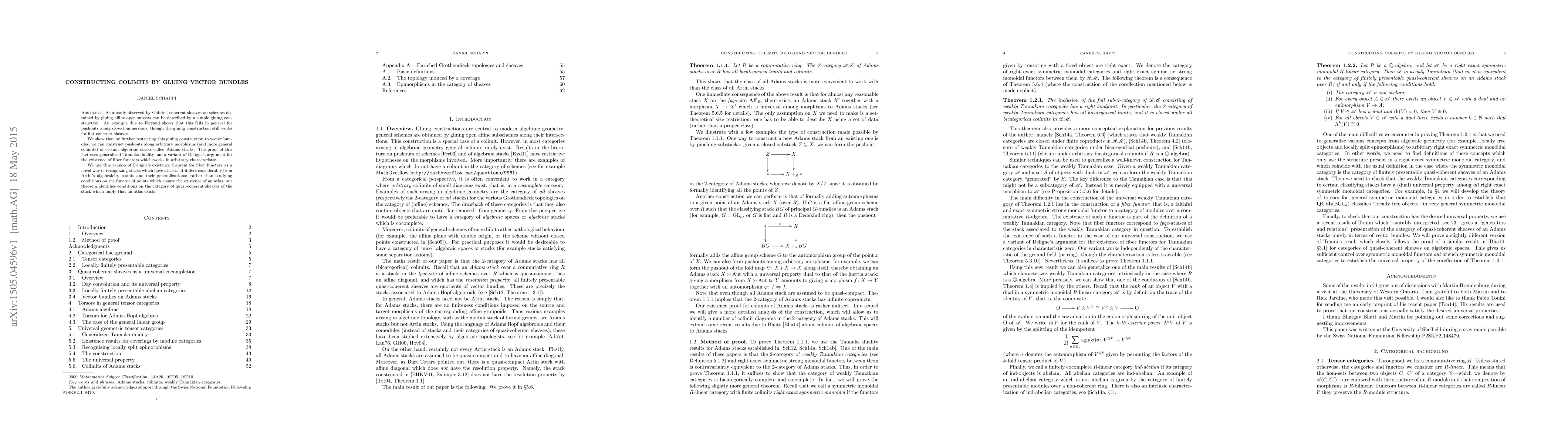 As already observed by Gabriel, coherent sheaves on schemes obtained by gluing affine open subsets can be described by a simple gluing construction. An example due to Ferrand shows that this fails in general for pushouts along closed immersions, though the gluing construction still works for flat coherent sheaves. We show that by further restricting this gluing construction to vector bundles, we can construct pushouts along arbitrary morphisms (and more general colimits) of certain algebraic stacks called Adams stacks. The proof of this fact uses generalized Tannaka duality and a variant of Deligne's argument for the existence of fiber functors which works in arbitrary characteristic. We use this version of Deligne's existence theorem for fiber functors as a novel way of recognizing stacks which have atlases. It differs considerably from Artin's algebraicity results and their generalizations: rather than studying conditions on the functor of points which ensure the existence of an atlas, our theorem identifies conditions on the category of quasi-coherent sheaves of the stack which imply that an atlas exists.