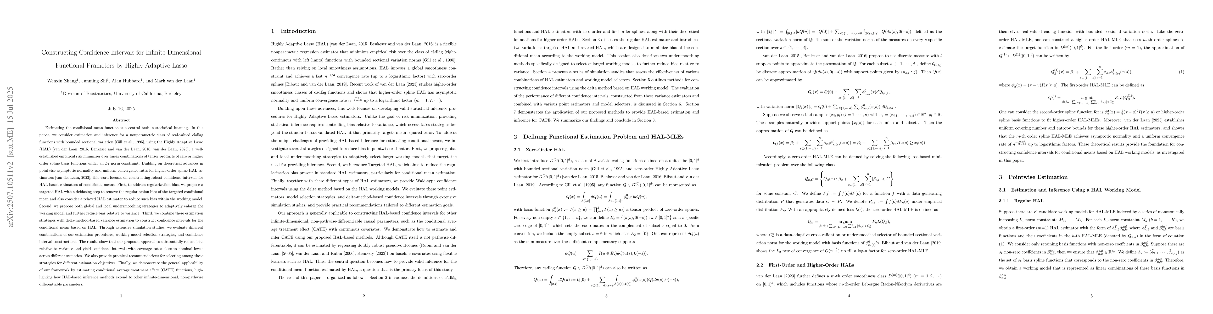 Estimating the conditional mean function is a central task in statistical learning. In this paper, we consider estimation and inference for a nonparametric class of real-valued c\`adl\`ag functions with bounded sectional variation (Gill et al., 1995), using the Highly Adaptive Lasso (HAL) (van der Laan, 2015; Benkeser and van der Laan, 2016; van der Laan, 2023), a flexible empirical risk minimizer over linear combinations of tensor products of zero- or higher-order spline basis functions under an L1 norm constraint. Building on recent theoretical advances in asymptotic normality and uniform convergence rates for higher-order spline HAL estimators (van der Laan, 2023), this work focuses on constructing robust confidence intervals for HAL-based conditional mean estimators. To address regularization bias, we propose a targeted HAL with a debiasing step to remove bias for the conditional mean, and also consider a relaxed HAL estimator to reduce bias. We also introduce both global and local undersmoothing strategies to adaptively select the working model, reducing bias relative to variance. Combined with delta-method-based variance estimation, we construct confidence intervals for conditional means based on HAL. Through simulations, we evaluate combinations of estimation and model selection strategies, showing that our methods substantially reduce bias and yield confidence intervals with coverage rates close to nominal levels across scenarios. We also provide recommendations for different estimation objectives and illustrate the generality of our framework by applying it to estimate conditional average treatment effect (CATE) functions, highlighting how HAL-based inference extends to other infinite-dimensional, non-pathwise differentiable parameters.