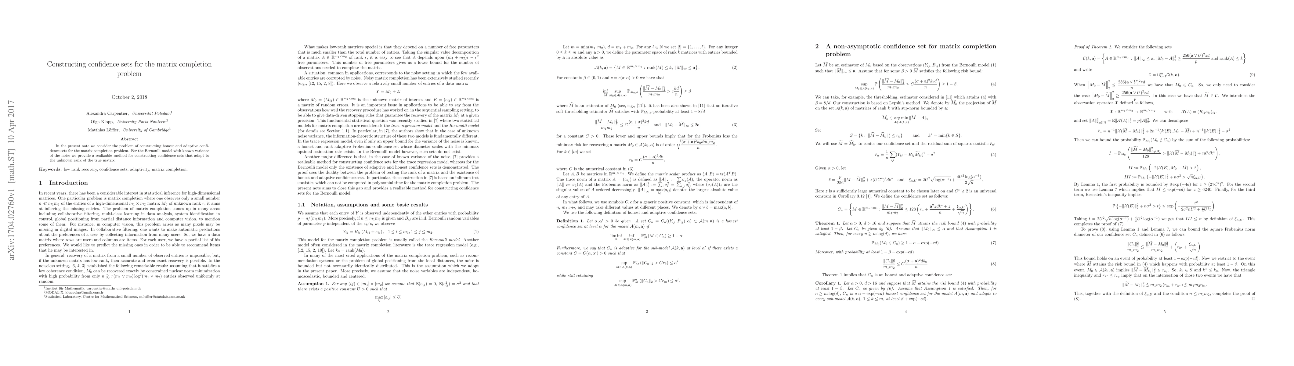 Summary: This paper presents a method for constructing adaptive confidence sets for the matrix completion problem under a Bernoulli model with known noise variance, allowing the sets to adapt to the unknown rank of the true matrix. The method ensures the integrity of the confidence sets.