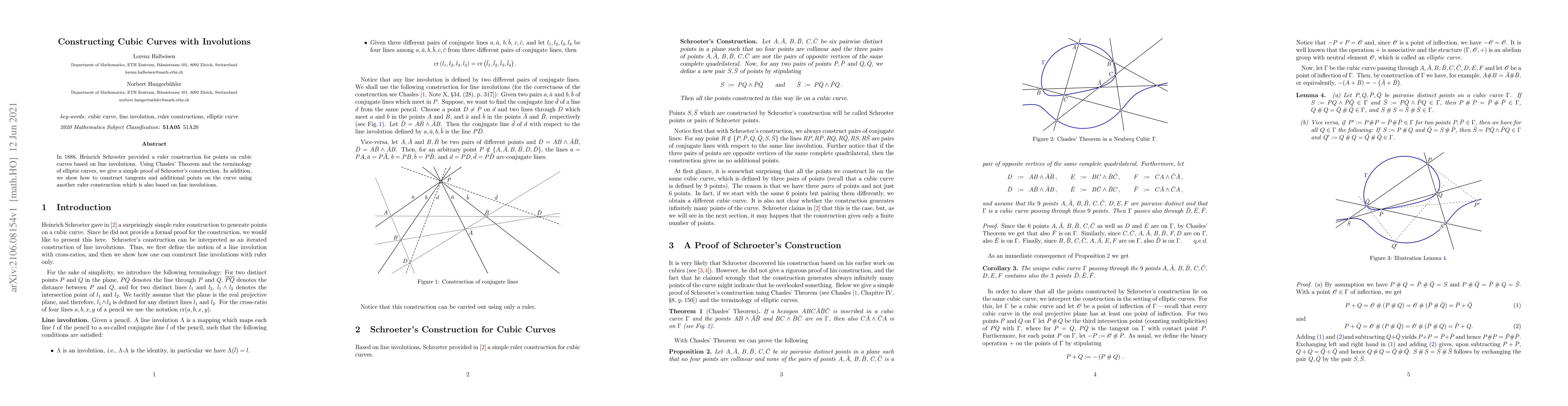 This paper presents a simple proof for Heinrich Schroeter's 1888 ruler construction of cubic curve points using line involutions, grounded in Chasles' Theorem and elliptic curve terminology. It also introduces another ruler construction method for tangents and additional curve points, also relying on line involutions.