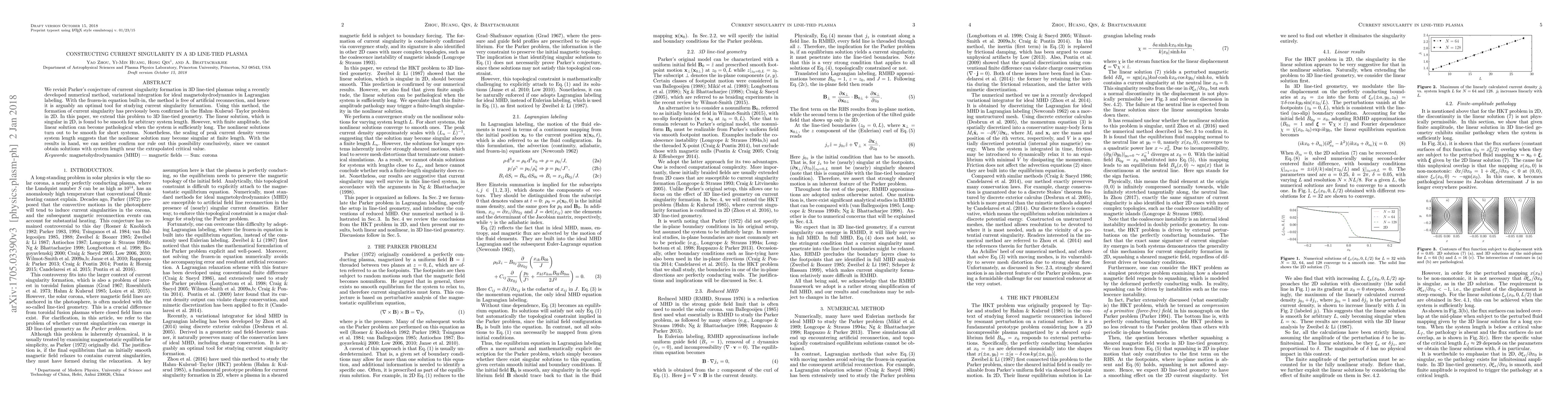 We revisit Parker's conjecture of current singularity formation in 3D line-tied plasmas using a recently developed numerical method, variational integration for ideal magnetohydrodynamics in Lagrangian labeling. With the frozen-in equation built-in, the method is free of artificial reconnection, and hence it is arguably an optimal tool for studying current singularity formation. Using this method, the formation of current singularity has previously been confirmed in the Hahm--Kulsrud--Taylor problem in 2D. In this paper, we extend this problem to 3D line-tied geometry. The linear solution, which is singular in 2D, is found to be smooth for arbitrary system length. However, with finite amplitude, the linear solution can become pathological when the system is sufficiently long. The nonlinear solutions turn out to be smooth for short systems. Nonetheless, the scaling of peak current density versus system length suggests that the nonlinear solution may become singular at finite length. With the results in hand, we can neither confirm nor rule out this possibility conclusively, since we cannot obtain solutions with system length near the extrapolated critical value.