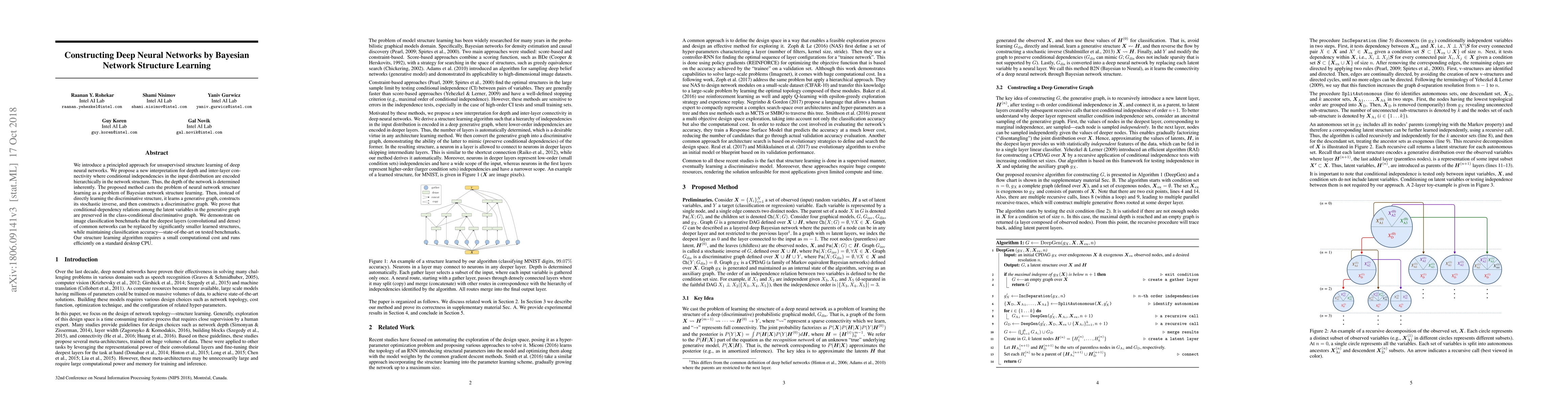 This paper proposes a method for unsupervised structure learning of deep neural networks by interpreting depth and connectivity through Bayesian network structure learning, achieving state-of-the-art classification accuracy while reducing the size of the network's deepest layers. The algorithm efficiently learns a generative graph and constructs a discriminative graph, preserving conditional dependencies.