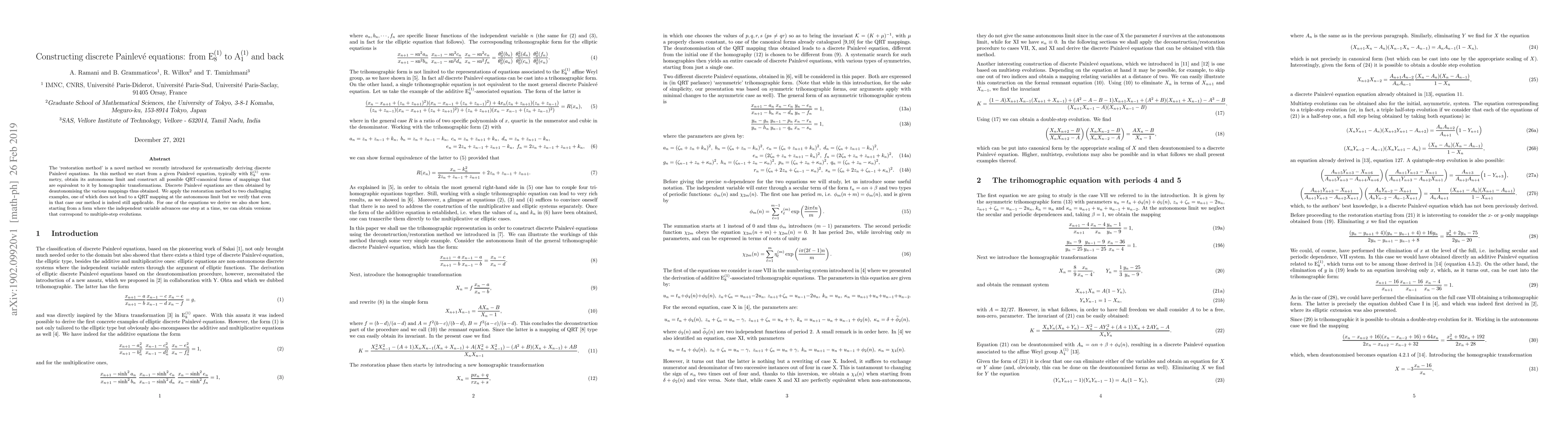 The `restoration method' is a novel method we recently introduced for systematically deriving discrete Painlev\'e equations. In this method we start from a given Painlev\'e equation, typically with E$_8^{(1)}$ symmetry, obtain its autonomous limit and construct all possible QRT-canonical forms of mappings that are equivalent to it by homographic transformations. Discrete Painlev\'e equations are then obtained by deautonomising the various mappings thus obtained. We apply the restoration method to two challenging examples, one of which does not lead to a QRT mapping at the autonomous limit but we verify that even in that case our method is indeed still applicable. For one of the equations we derive we also show how, starting from a form where the independent variable advances one step at a time, we can obtain versions that correspond to multiple-step evolutions.