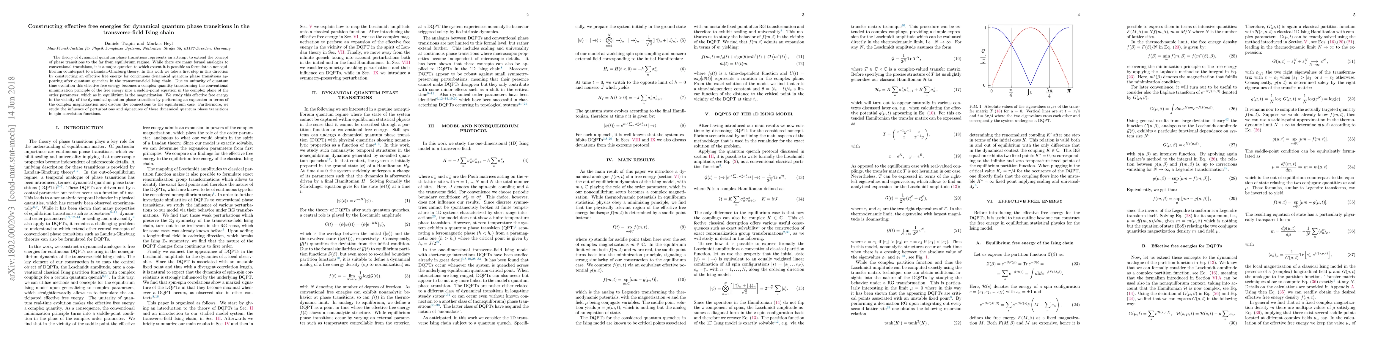 This paper constructs an effective free energy for dynamical quantum phase transitions in the transverse-field Ising chain, transforming the conventional free energy minimization into a complex saddle-point equation. It explores the connections to equilibrium phase transitions and examines perturbations and signatures in spin correlation functions.
