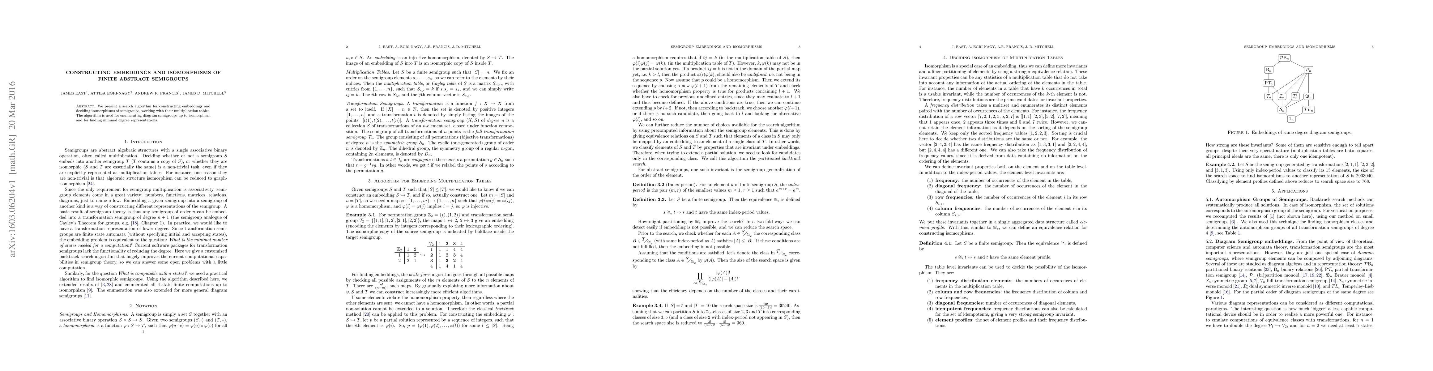 Summary: This paper introduces a search algorithm for constructing embeddings and determining isomorphisms of finite abstract semigroups based on their multiplication tables. The algorithm is applied to enumerate diagram semigroups up to isomorphism and to identify minimal degree representations.