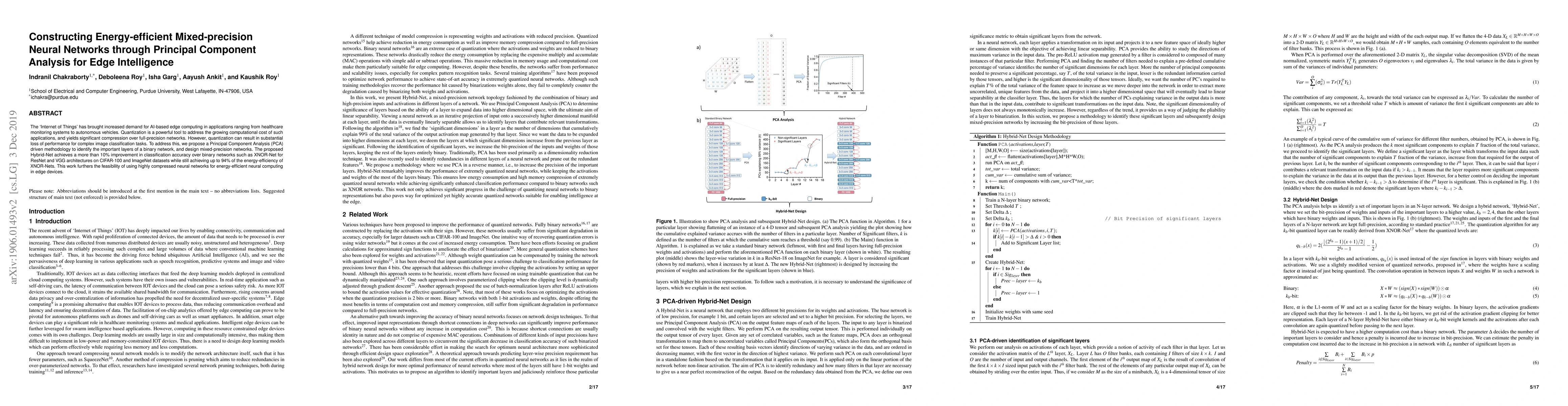The `Internet of Things' has brought increased demand for AI-based edge computing in applications ranging from healthcare monitoring systems to autonomous vehicles. Quantization is a powerful tool to address the growing computational cost of such applications, and yields significant compression over full-precision networks. However, quantization can result in substantial loss of performance for complex image classification tasks. To address this, we propose a Principal Component Analysis (PCA) driven methodology to identify the important layers of a binary network, and design mixed-precision networks. The proposed Hybrid-Net achieves a more than 10% improvement in classification accuracy over binary networks such as XNOR-Net for ResNet and VGG architectures on CIFAR-100 and ImageNet datasets while still achieving up to 94% of the energy-efficiency of XNOR-Nets. This work furthers the feasibility of using highly compressed neural networks for energy-efficient neural computing in edge devices.
