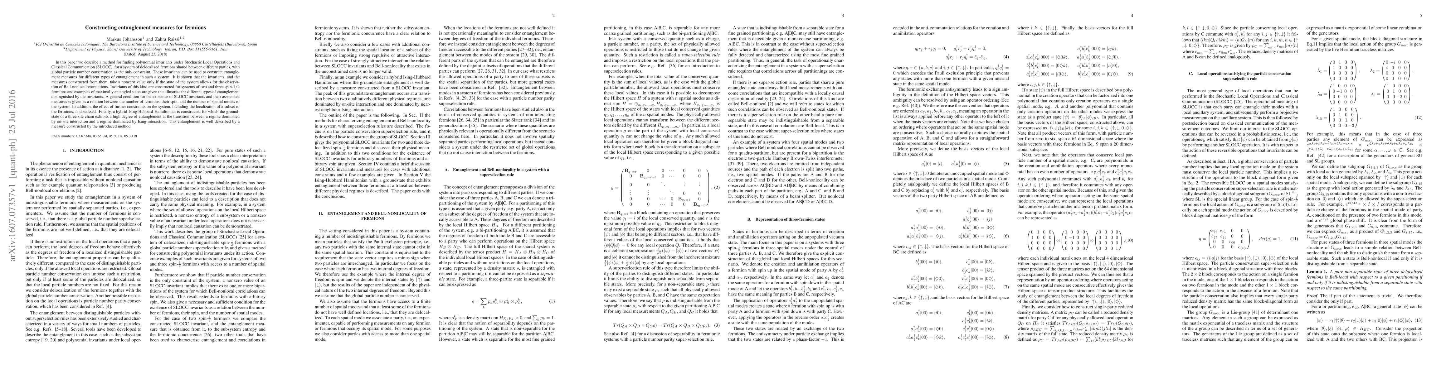 In this paper we describe a method for finding polynomial invariants under Stochastic Local Operations and Classical Communication (SLOCC), for a system of delocalized fermions shared between different parties, with global particle number conservation as the only constraint. These invariants can be used to construct entanglement measures for different types of entanglement in such a system. It is shown that the invariants, and the measures constructed from them, take a nonzero value only if the state of the system allows for the observation of Bell-nonlocal correlations. Invariants of this kind are constructed for systems of two and three spin-1/2 fermions and examples of maximally entangled states are given that illustrate the different types of entanglement distinguished by the invariants. A general condition for the existence of SLOCC invariants and their associated measures is given as a relation between the number of fermions, their spin, and the number of spatial modes of the system. In addition, the effect of further constraints on the system, including the localization of a subset of the fermions, is discussed. Finally, a hybrid Ising-Hubbard Hamiltonian is constructed for which the groundstate of a three site chain exhibits a high degree of entanglement at the transition between a regime dominated by on-site interaction and a regime dominated by Ising-interaction. This entanglement is well described by a measure constructed by the introduced method.