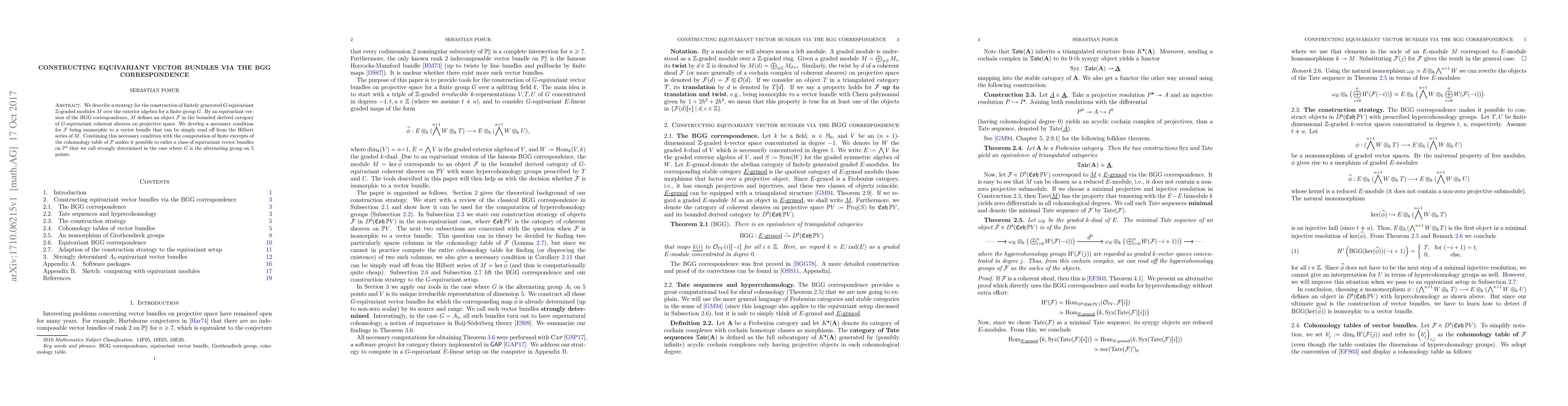 We describe a strategy for the construction of finitely generated $G$-equivariant $\mathbb{Z}$-graded modules $M$ over the exterior algebra for a finite group $G$. By an equivariant version of the BGG correspondence, $M$ defines an object $\mathcal{F}$ in the bounded derived category of $G$-equivariant coherent sheaves on projective space. We develop a necessary condition for $\mathcal{F}$ being isomorphic to a vector bundle that can be simply read off from the Hilbert series of $M$. Combining this necessary condition with the computation of finite excerpts of the cohomology table of $\mathcal{F}$ makes it possible to enlist a class of equivariant vector bundles on $\mathbb{P}^4$ that we call strongly determined in the case where $G$ is the alternating group on $5$ points.
