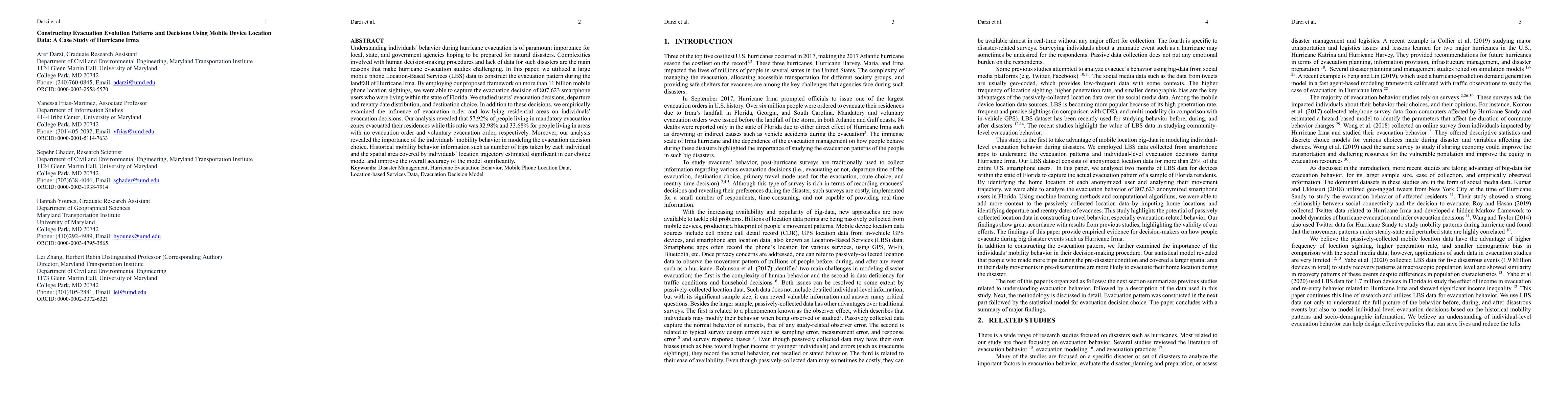 This paper analyzes evacuation patterns during Hurricane Irma using mobile device location data from over 11 billion sightings, revealing that 57.92% of residents in mandatory evacuation zones evacuated, compared to 32.98% in non-mandatory zones. Historical mobility behavior significantly improved the accuracy of evacuation decision models.