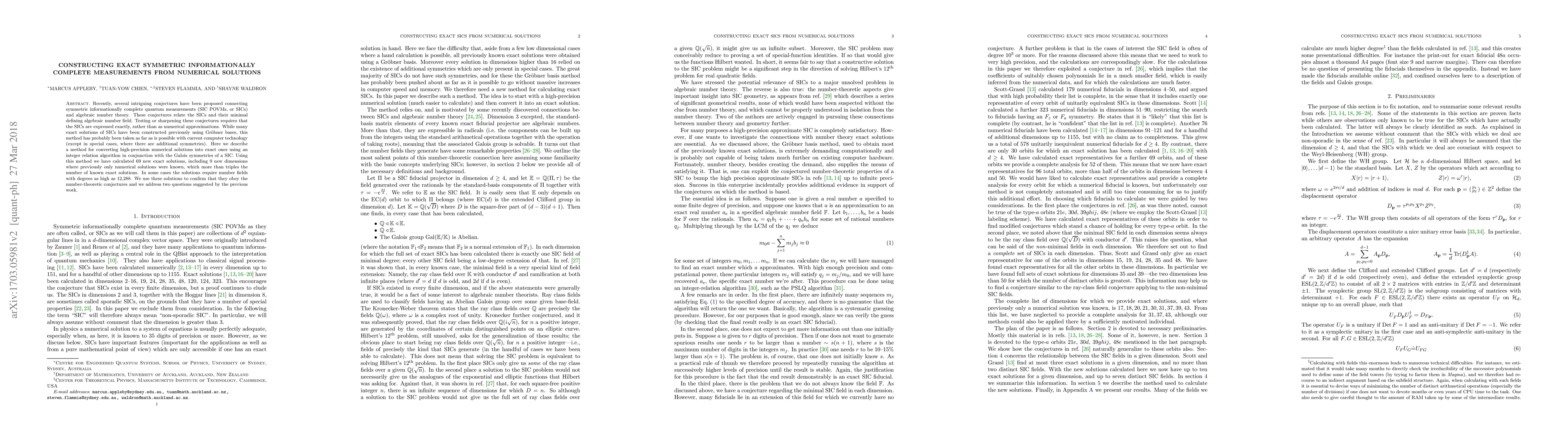 Recently, several intriguing conjectures have been proposed connecting symmetric informationally complete quantum measurements (SIC POVMs, or SICs) and algebraic number theory. These conjectures relate the SICs and their minimal defining algebraic number field. Testing or sharpening these conjectures requires that the SICs are expressed exactly, rather than as numerical approximations. While many exact solutions of SICs have been constructed previously using Gr\"obner bases, this method has probably been taken as far as is possible with current computer technology (except in special cases where there are additional symmetries). Here we describe a method for converting high-precision numerical solutions into exact ones using an integer relation algorithm in conjunction with the Galois symmetries of a SIC. Using this method we have calculated 69 new exact solutions, including 9 new dimensions where previously only numerical solutions were known, which more than triples the number of known exact solutions. In some cases the solutions require number fields with degrees as high as 12,288. We use these solutions to confirm that they obey the number-theoretic conjectures and we address two questions suggested by the previous work.