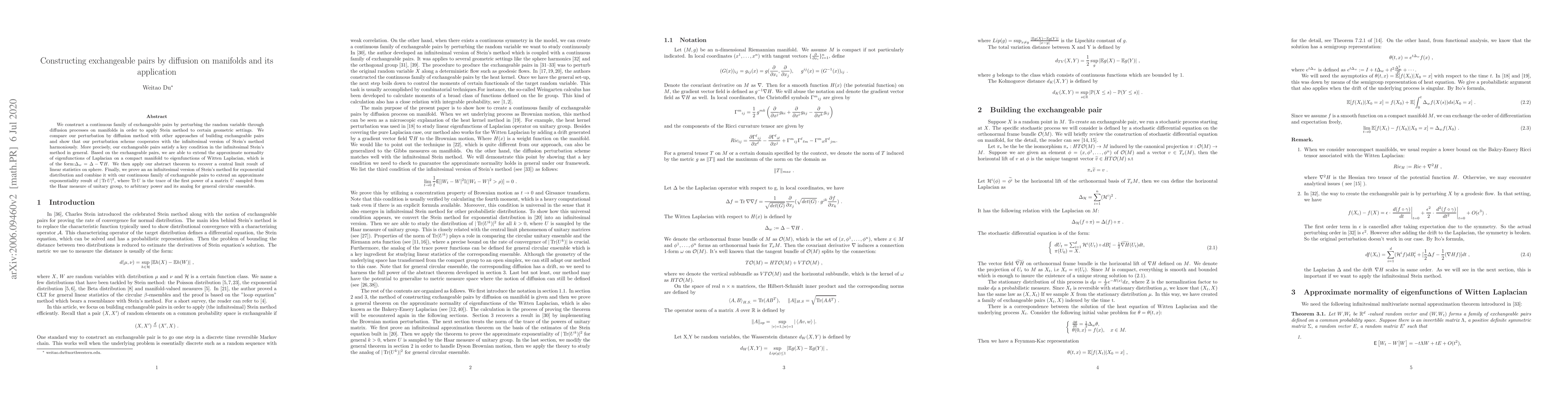 We construct a continuous family of exchangeable pairs by perturbing the random variable through diffusion processes on manifold in order to apply Stein method to certain geometric settings. We compare our perturbation by diffusion method with other approaches of building exchangeable pairs and show that our perturbation scheme cooperates with the infinitesimal version of Stein's method harmoniously. More precisely, our exchangeable pairs satisfy a key condition in the infinitesimal Stein's method in general. Based on the exchangeable pairs, we are able to extend the approximate normality of eigenfunctions of Laplacian on compact manifold to eigenfunctions of Witten Laplacian, which is of the form:$\Delta_w = \Delta - \nabla H$. We then apply our abstract theorem to recover a central limit result of linear statistics on sphere. Finally, we prove an an infinitesimal version of Stein's method for exponential distribution and combine it with our continuous family of exchangeable pairs to extend an approximate exponentiality result of $|Tr U|^2$, where $Tr U$ is the trace of the first power of a matrix $U$ sampled from the Haar measure of unitary group, to arbitrary power and its analog for general circular ensemble.