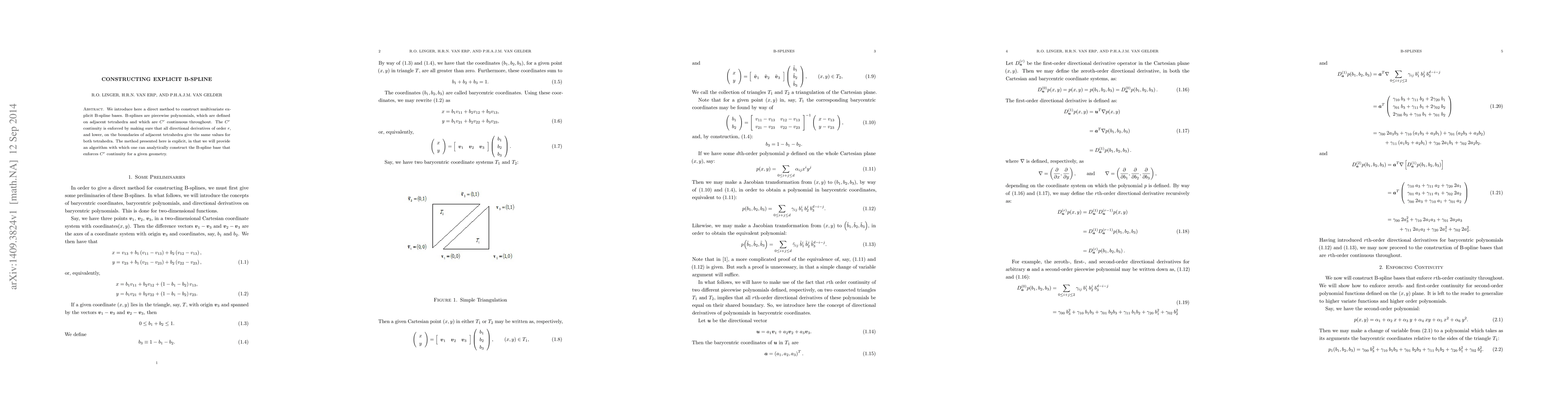 We introduce here a direct method to construct multivariate explicit B-spline bases. B-splines are piecewise polynomials, which are defined on adjacent tetrahedra and which are $C^{r}$ continuous throughout. The $C^{r}$ continuity is enforced by making sure that all directional derivatives of order $r$, and lower, on the boundaries of adjacent tetrahedra give the same values for both tetrahedra. The method presented here is explicit, in that we will provide an algorithm with which one can analytically construct the B-spline base that enforces $C^{r}$ continuity for a given geometry.