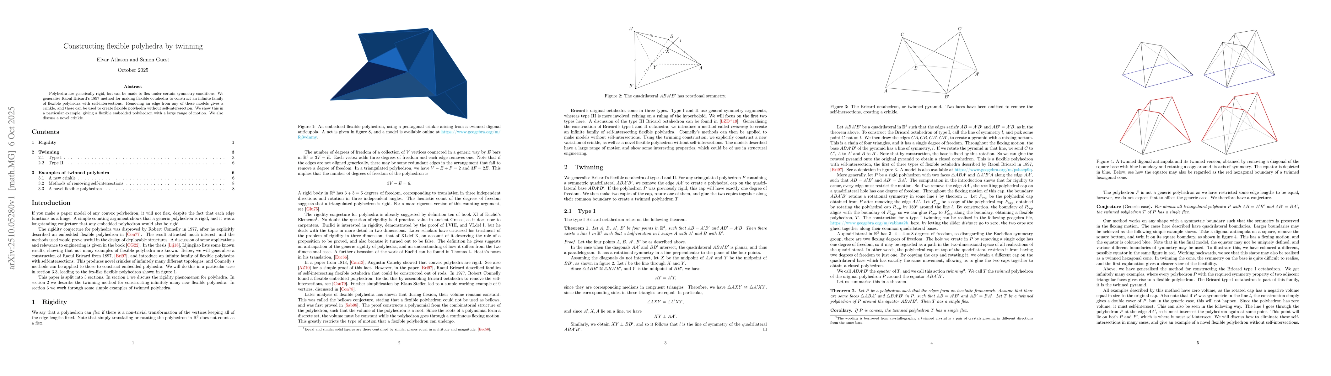 The research generalizes Raoul Bricard's method for constructing flexible octahedra by introducing a twinning approach, where a polyhedron is combined with a rotated copy of itself along a symmetric boundary to create flexible structures with self-intersections.