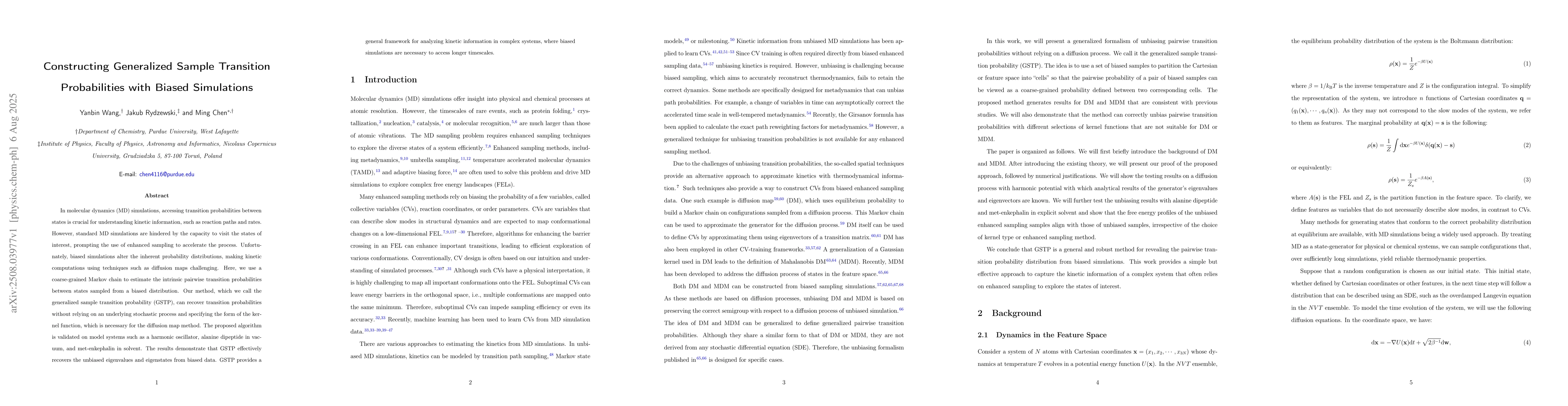 In molecular dynamics (MD) simulations, accessing transition probabilities between states is crucial for understanding kinetic information, such as reaction paths and rates. However, standard MD simulations are hindered by the capacity to visit the states of interest, prompting the use of enhanced sampling to accelerate the process. Unfortunately, biased simulations alter the inherent probability distributions, making kinetic computations using techniques such as diffusion maps challenging. Here, we use a coarse-grained Markov chain to estimate the intrinsic pairwise transition probabilities between states sampled from a biased distribution. Our method, which we call the generalized sample transition probability (GSTP), can recover transition probabilities without relying on an underlying stochastic process and specifying the form of the kernel function, which is necessary for the diffusion map method. The proposed algorithm is validated on model systems such as a harmonic oscillator, alanine dipeptide in vacuum, and met-enkephalin in solvent. The results demonstrate that GSTP effectively recovers the unbiased eigenvalues and eigenstates from biased data. GSTP provides a general framework for analyzing kinetic information in complex systems, where biased simulations are necessary to access longer timescales.