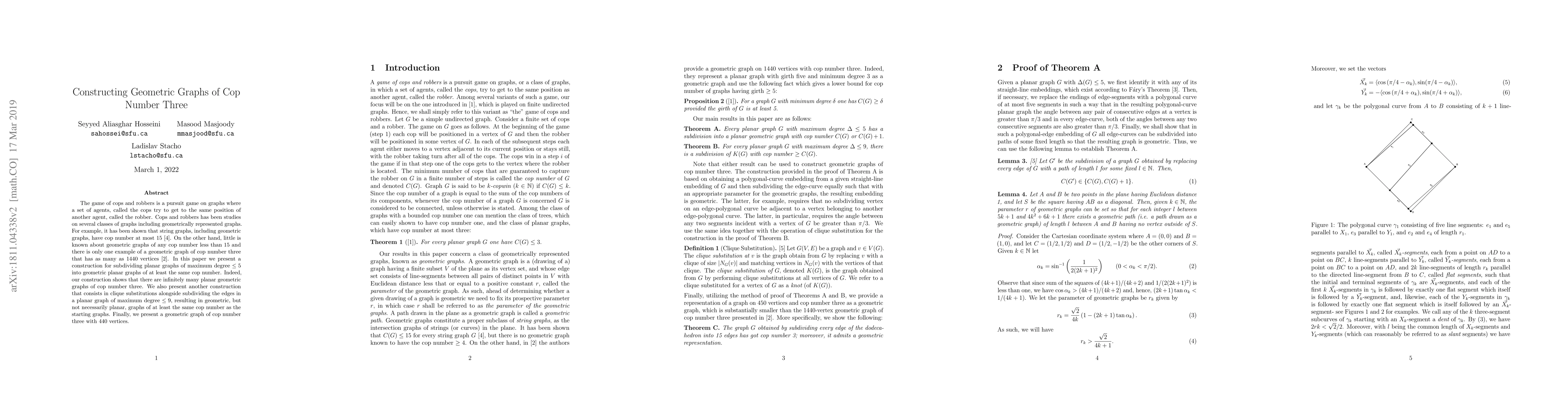 This paper constructs geometric planar graphs of cop number three by subdividing planar graphs with maximum degree ≤ 5. It also presents a method using clique substitutions and edge subdivisions to create geometric graphs of cop number three from planar graphs with maximum degree ≤ 9.