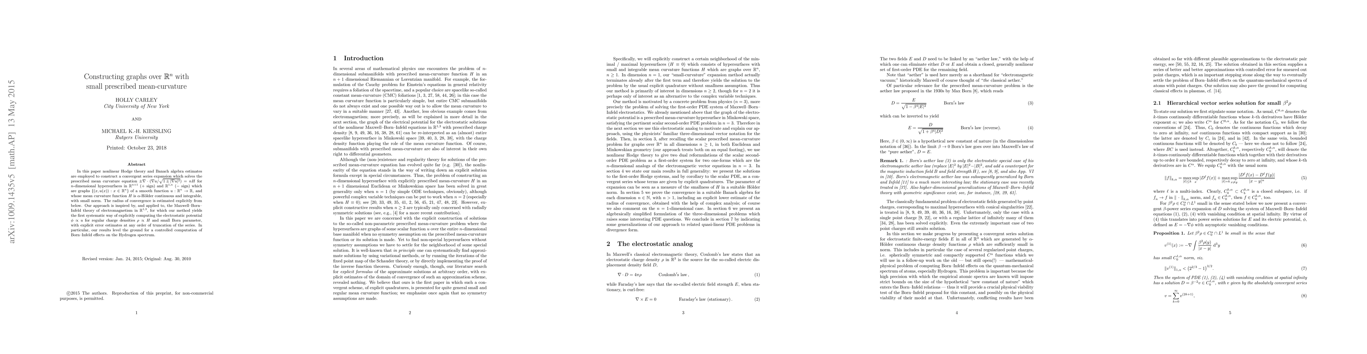 This paper develops a convergent series expansion to solve the prescribed mean curvature equation for n-dimensional hypersurfaces in n+1 dimensional space, inspired by the Maxwell-Born-Infeld theory. The method provides a systematic way to compute the electrostatic potential for regular charge densities.