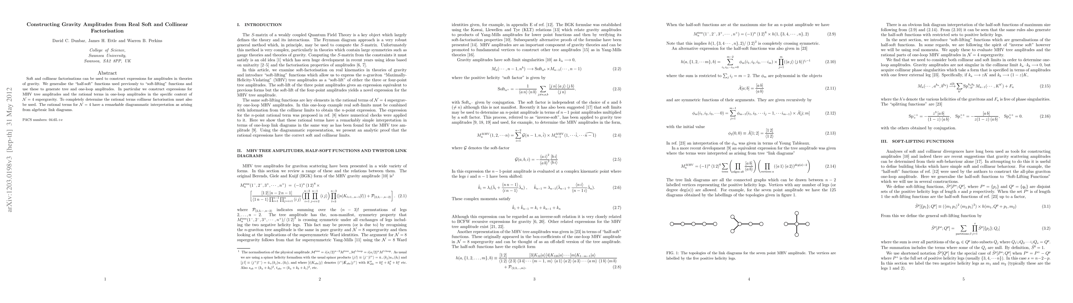 This paper constructs gravity amplitudes using real soft and collinear factorisation, generalising "half-soft" functions to "soft-lifting" functions to generate tree and one-loop amplitudes, particularly focusing on MHV tree amplitudes and rational terms in one-loop amplitudes for N=4 supergravity, with a notable diagrammatic interpretation from algebraic link diagrams.