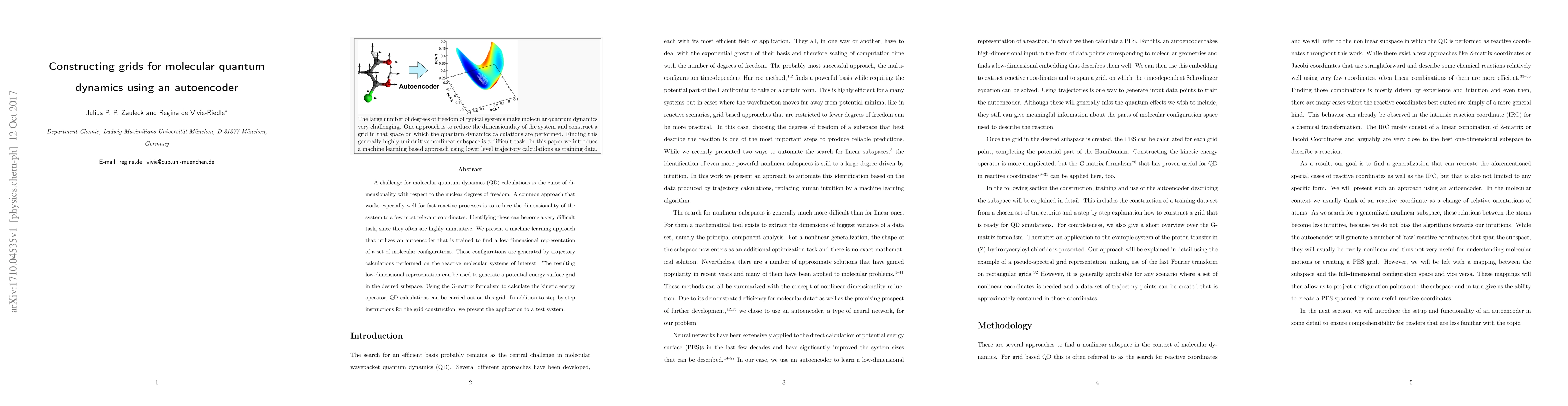 A challenge for molecular quantum dynamics (QD) calculations is the curse of dimensionality with respect to the nuclear degrees of freedom. A common approach that works especially well for fast reactive processes is to reduce the dimensionality of the system to a few most relevant coordinates. Identifying these can become a very difficult task, since they often are highly unintuitive. We present a machine learning approach that utilizes an autoencoder that is trained to find a low-dimensional representation of a set of molecular configurations. These configurations are generated by trajectory calculations performed on the reactive molecular systems of interest. The resulting low-dimensional representation can be used to generate a potential energy surface grid in the desired subspace. Using the G-matrix formalism to calculate the kinetic energy operator, QD calculations can be carried out on this grid. In addition to step-by-step instructions for the grid construction, we present the application to a test system.