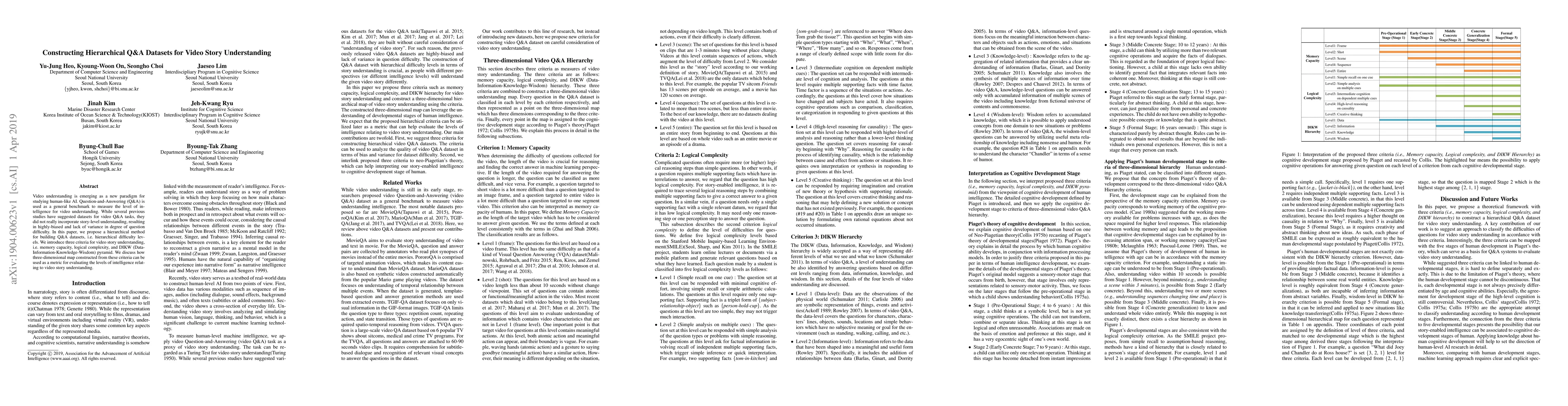 This paper proposes a method for creating hierarchical Q&A datasets to improve video story understanding, addressing the lack of variance in previous datasets. It introduces three criteria—memory capacity, logical complexity, and the DIKW pyramid—to evaluate intelligence levels in video comprehension.