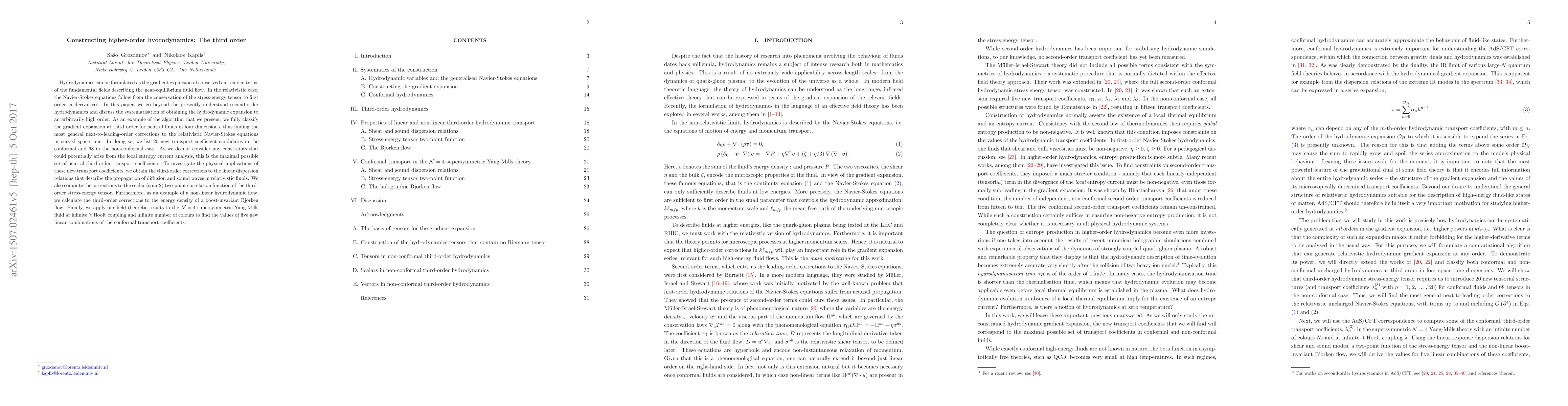 Hydrodynamics can be formulated as the gradient expansion of conserved currents in terms of the fundamental fields describing the near-equilibrium fluid flow. In the relativistic case, the Navier-Stokes equations follow from the conservation of the stress-energy tensor to first order in derivatives. In this paper, we go beyond the presently understood second-order hydrodynamics and discuss the systematisation of obtaining the hydrodynamic expansion to an arbitrarily high order. As an example of the algorithm that we present, we fully classify the gradient expansion at third order for neutral fluids in four dimensions, thus finding the most general next-to-leading-order corrections to the relativistic Navier-Stokes equations in curved space-time. In doing so, we list $20$ new transport coefficient candidates in the conformal and $68$ in the non-conformal case. As we do not consider any constraints that could potentially arise from the local entropy current analysis, this is the maximal possible set of neutral third-order transport coefficients. To investigate the physical implications of these new transport coefficients, we obtain the third-order corrections to the linear dispersion relations that describe the propagation of diffusion and sound waves in relativistic fluids. We also compute the corrections to the scalar (spin-$2$) two-point correlation function of the third-order stress-energy tensor. Furthermore, as an example of a non-linear hydrodynamic flow, we calculate the third-order corrections to the energy density of a boost-invariant Bjorken flow. Finally, we apply our field theoretic results to the $\mathcal{N}=4$ supersymmetric Yang-Mills fluid at infinite 't Hooft coupling and infinite number of colours to find the values of five new linear combinations of the conformal transport coefficients.