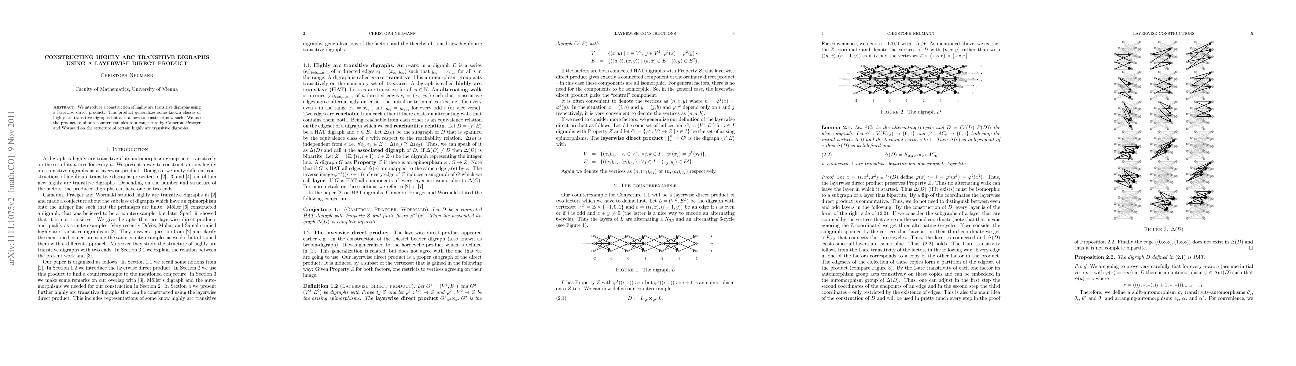 Summary: The paper presents a new method to construct highly arc transitive digraphs through a layerwise direct product, generalizing existing classes and providing counterexamples to a conjecture by Cameron, Praeger, and Wormald regarding their structure.