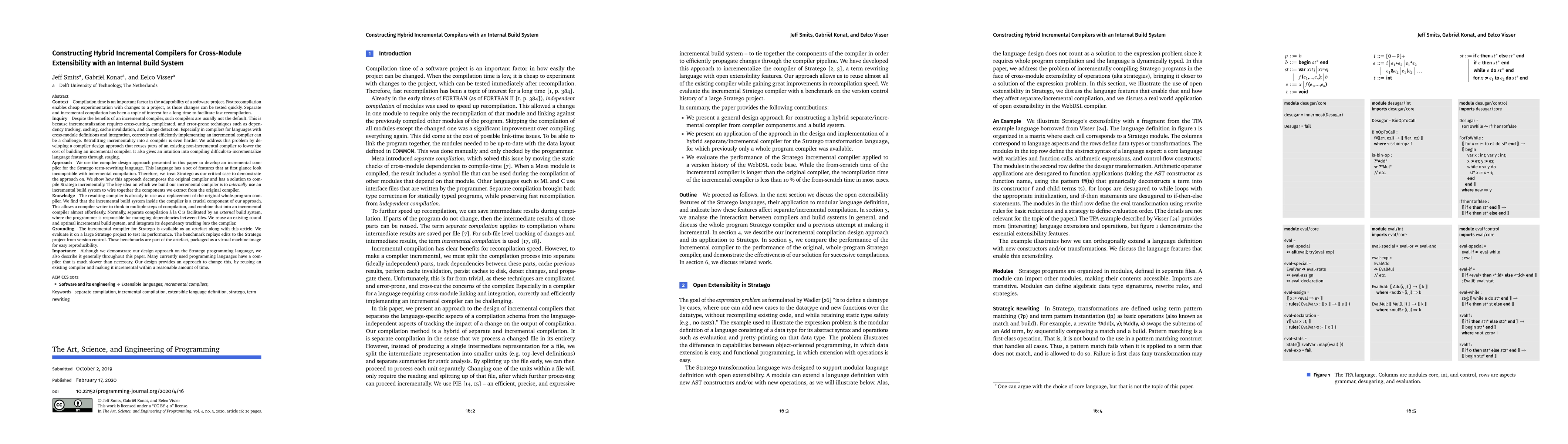 This paper explores constructing hybrid incremental compilers for cross-module extensibility using an internal build system, demonstrating the approach with the Stratego term-rewriting language. It shows how integrating an incremental build system within the compiler can facilitate efficient incremental compilation, significantly reducing compilation time and enabling faster experimentation.