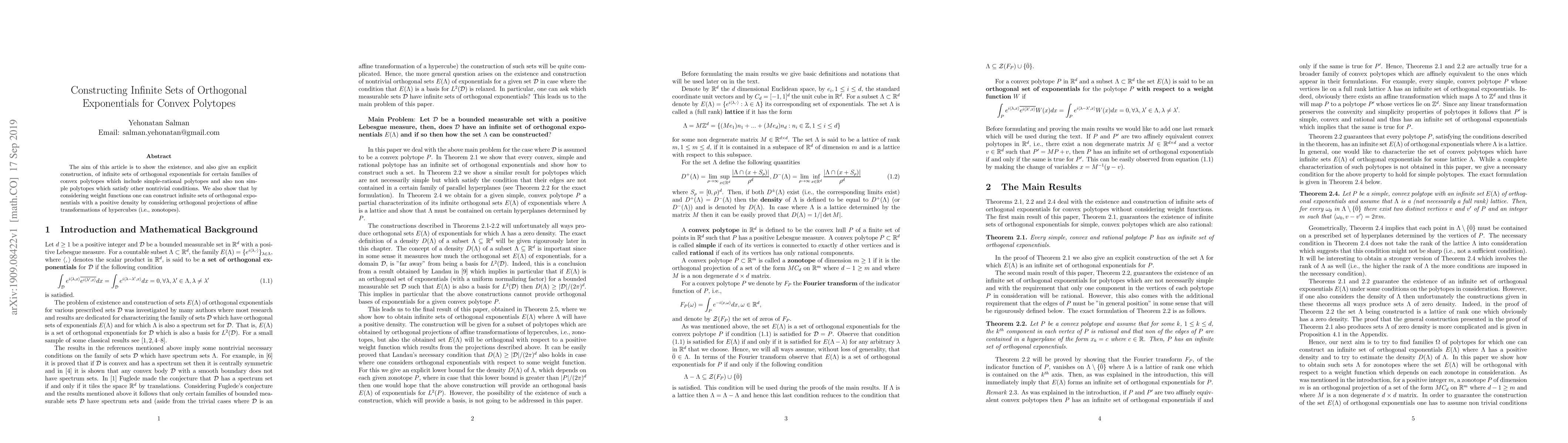 This paper constructs infinite sets of orthogonal exponentials for specific families of convex polytopes, including simple-rational and non-simple polytopes under certain conditions. It also demonstrates the construction of dense sets using weight functions and orthogonal projections of affine transformations of hypercubes (zonotopes).