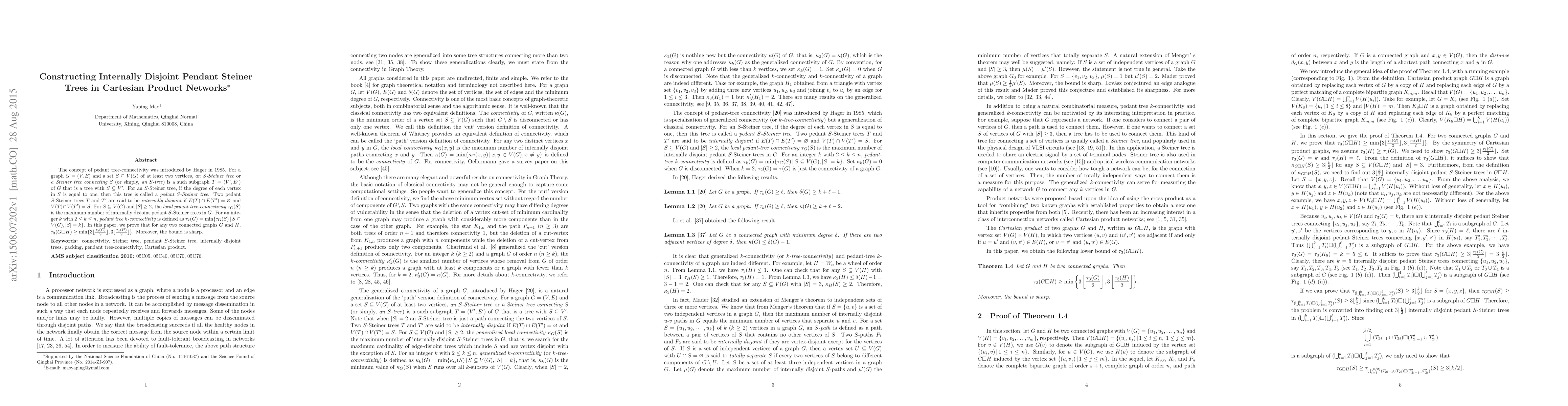 This paper establishes a lower bound for internally disjoint pendant Steiner trees in Cartesian product networks, showing that the number of such trees is at least the minimum of two-thirds of the number of trees between two connected graphs.