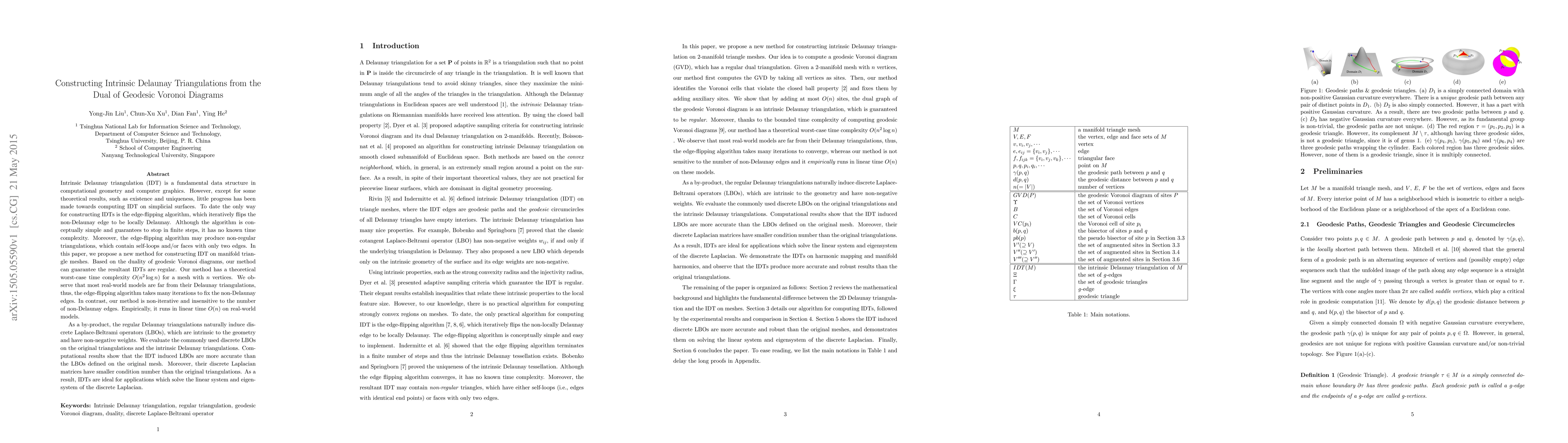 This paper proposes a new method to construct intrinsic Delaunay triangulations (IDT) on manifold triangle meshes, leveraging the duality of geodesic Voronoi diagrams to ensure regularity. Unlike the iterative edge-flipping algorithm, this non-iterative method runs in linear time $O(n)$ on real-world models, contrasting with a theoretical worst-case time complexity of $O(n^2\log n)$.