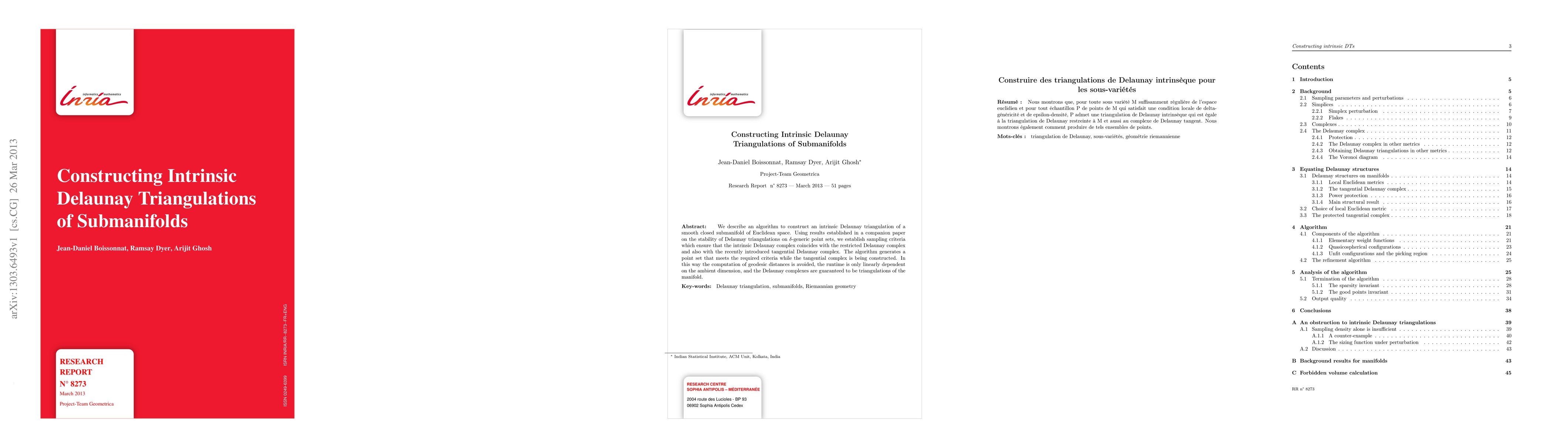 This paper proposes an algorithm for constructing intrinsic Delaunay triangulations of smooth closed submanifolds in Euclidean space, ensuring alignment with restricted and tangential Delaunay complexes through specified sampling criteria, thereby avoiding geodesic distance computations and maintaining linear runtime dependency on dimension.