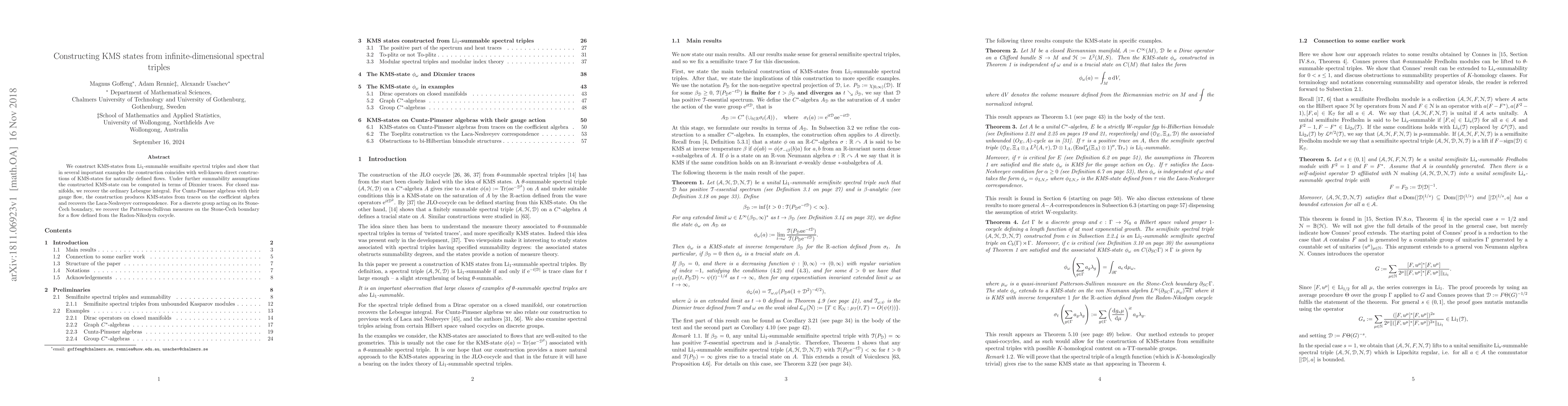 We construct KMS-states from $\mathrm{Li}_1$-summable semifinite spectral triples and show that in several important examples the construction coincides with well-known direct constructions of KMS-states for naturally defined flows. Under further summability assumptions the constructed KMS-state can be computed in terms of Dixmier traces. For closed manifolds, we recover the ordinary Lebesgue integral. For Cuntz-Pimsner algebras with their gauge flow, the construction produces KMS-states from traces on the coefficient algebra and recovers the Laca-Neshveyev correspondence. For a discrete group acting on its Stone-\v{C}ech boundary, we recover the Patterson-Sullivan measures on the Stone-\v{C}ech boundary for a flow defined from the Radon-Nikodym cocycle.