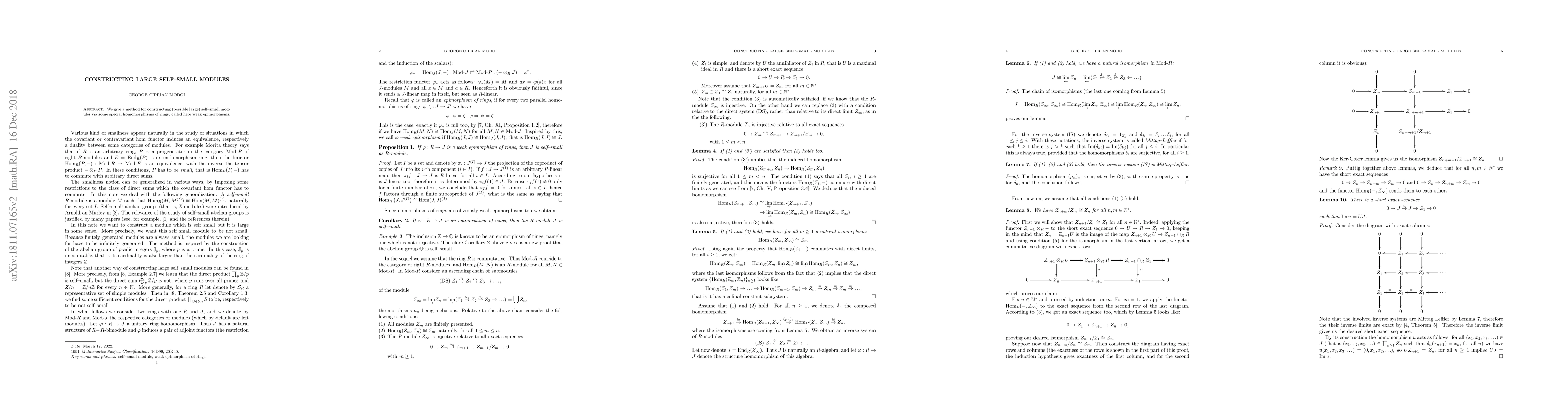 We give a method for constructing (possible large) self--small modules via some special homomorphisms of rings, called here weak epimorphisms.