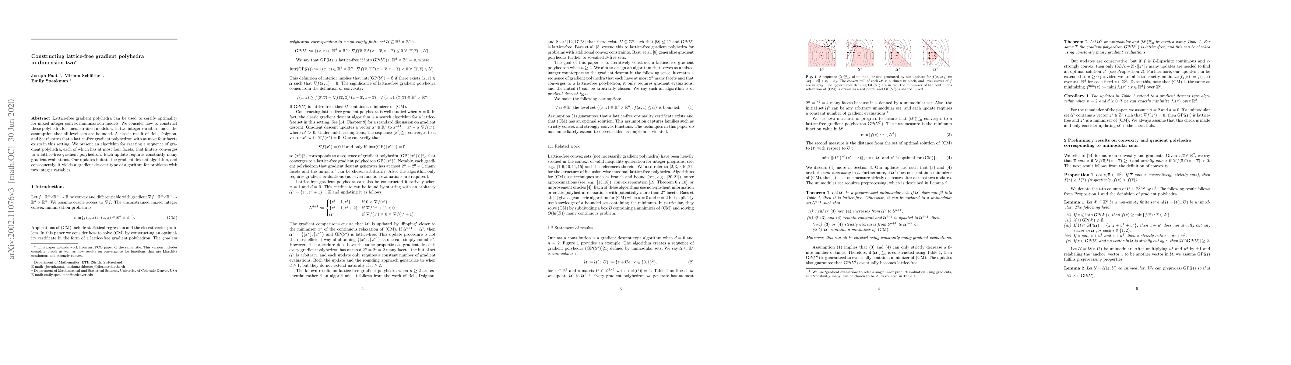 Lattice-free gradient polyhedra can be used to certify optimality for mixed-integer convex minimization models. We consider how to construct these polyhedra for unconstrained models with two integer variables under the assumption that all level sets are bounded. A classic result of Bell, Doignon, and Scarf states that a lattice-free gradient polyhedron with at most four facets exists in this setting. We present an algorithm for creating a sequence of gradient polyhedra, each of which has at most four facets, that finitely converges to a lattice-free gradient polyhedron. Each update requires constantly many gradient evaluations. Our updates imitate the gradient descent algorithm, and consequently, it yields a gradient descent type of algorithm for problems with two integer variables.